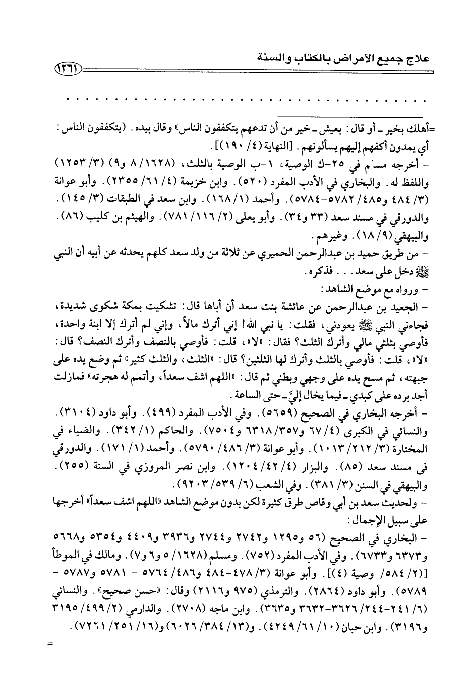 - ولحديث سعد بن أبي وقاص طرق كثيرة لكن بدون موضع الشاهد «اللهم اشف سعدًا» أخرجها على سبيل الإجمال:
