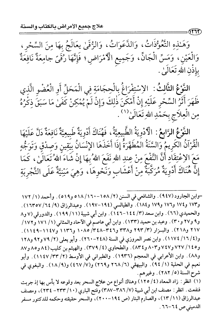 (¬١) انظر: زاد المعاد (٤/ ١٢٥) وهناك أنواع من علاج السحر بعد وقوعه لا بأس بها إذ جربت فنفعت. انظر: مصنف ابن أبي شيبة (٧/ ٣٨٦ - ٣٨٧) وفتح الباري (١٠/ ٢٣٣ - ٢٣٤)، ومصنف عبد الرزاق (١١/ ١٣)، والصارم البتار (ص ١٩٤ - ٢٠٠)، والسحر وحقيقته وحكمه للدكتور مسفر الدميني ص ٦٤ - ٦٦.