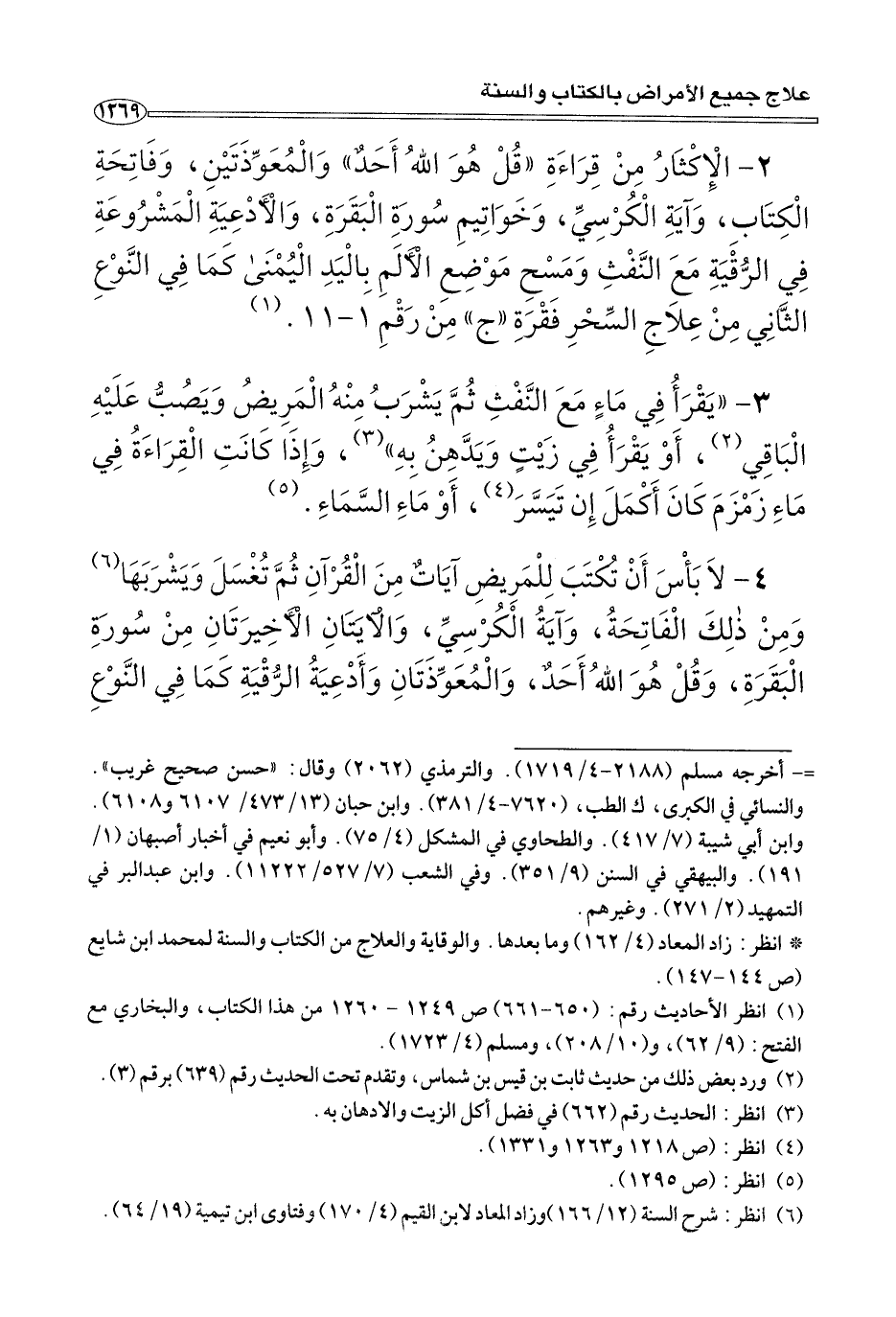 ٢ - الْإِكْثَارُ مِنْ قِرَاءَةِ «قُلْ هُوَ اللهُ أَحَدٌ» وَالْمُعَوِّذَتَيْنِ، وَفَاتِحَةِ الْكِتَابِ، وَآيَةِ الْكُرْسِيِّ، وَخَوَاتِيمِ سُورَةِ الْبَقَرَةِ، وَالْأَدْعِيَةِ الْمَشْرُوعَةِ فِي الرُّقْيَةِ مَعَ النَّفْثِ وَمَسْحِ مَوْضِع ِالْأَلَمِ بِالْيَدِ الْيُمْنَى كَماَ فِي النَّوْعِ الثَّانِي مِنْ عِلَاج ِالسّحْرِ فَقْرَةِ «ج» مِنْ رقم ١ - ١١. (¬١)