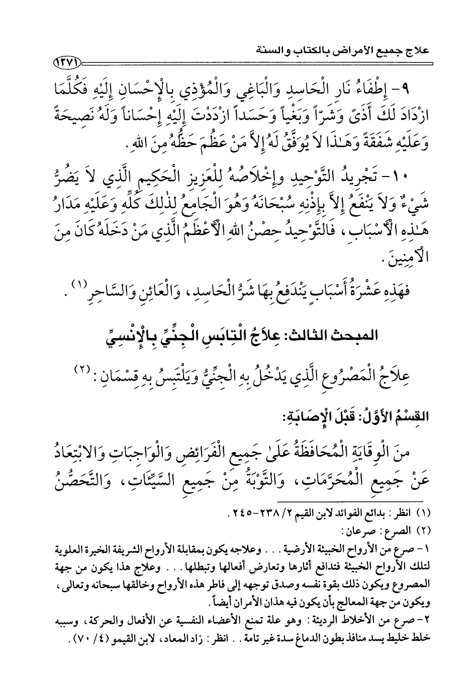 عِلَاجُ الْمَصْرُوعِ الَّذِي يَدْخُلُ بِهِ الْجِنِّيُّ وَيَلْتَبِسُ بِهِ قِسْمَانِ: (¬٢)