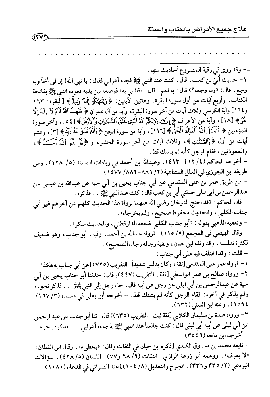 ١ - حديث أُ بيّ بن كعب، قال: كنت عند النبي صلى الله عليه وسلم فجاء أعرابي فقال: يا نبي الله! إن لي أخًا وبه وجع، قال: «وما وجعه؟» قال: به لمم. قال: «فائتني به» فوضعه بين يديه فعوذه النبي صلى الله عليه وسلم بفاتحة الكتاب، وأربع آيات من أول سورة البقرة، وهاتين الآيتين: {وإِلَهُكُمْ إلَهٌ وَاحِدٌ} [البقرة: ١٦٣ و ١٦٤] وآية الكرسي وثلاث آيات من آخر سورة البقرة، وآية من آل عمران {شَهِدَ اللهُ أَنَّهُ لَا إِلَه إِلَّا هُوَ} [١٨]، وآية من سورة الأعراف: {إِنَّ رَبَّكُمُ اللهُ الَّذِي خَلَقَ السَّمَوَاتِ والْأَرْضَ} [٥٤]، وآخر سورة المؤمنين: {فَتَعَلَى اللهُ الْمَلِكُ الْحَقُّ} [١١٦]، وآية من سورة الجن {وأَنَّهُ تَعَلَى جَدُّ رَبِّنَا} [٣]، وعشر آيات من أول {وَالصَّفَّتِ}، وثلاثة من آخر سورة الحشر، و {قُلْ هُوَ اللهُ أَحَدٌ} والمعوذتين، فقام الرجل كأنه لم يشتك قط.