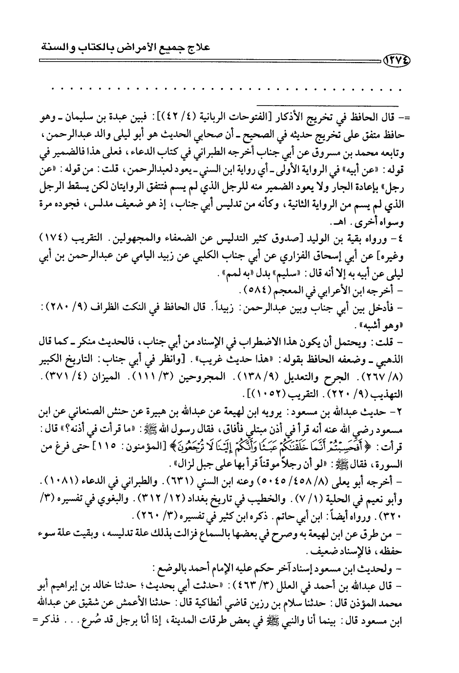 ٢ - حديث عبد الله بن مسعود: يرويه ابن لهيعة عن عبد الله بن هبيرة عن حنش الصنعاني عن أبن مسعود رضي الله عنه أنه قرأ في أذن مبتلى فأفاق، فقال رسول الله صلى الله عليه وسلم: «ما قرأت في أذنه؟» قال: قرأت: {أَفَحَسِبْتُم أَنَمَا خَلَقْنَكُمْ عَبَثًَا وَأَنَّكُم إِلَيْنَا لَا تُرْجَعُونَ} [المؤمنون: ١١٥] حتى فرغ من السورة، فقال صلى الله عليه وسلم: «لو أن رجلًا موقنًا قرأ بها على جبل لزال».