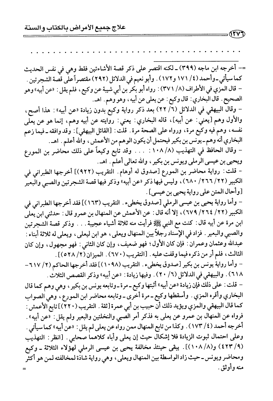 -قلت: على ذلك فإن زيادة «عن أبيه» أثبتها وكيع- مرة أخرى- وتابعه يونس بن بكير، وهي وهم كما قال البخاري وأقره المزي. وأسقطها وكيع- مرة أخرى- وتابعه محاضر ابن المورع، وهي الصواب كما قال البيهقي والمزي ويؤيد ذلك أن حبيب بن أبي عمرة [ثقة. التقريب (٢٢٠)] تابع الأعمش: فرواه عن المنهال بن عمرو عن يعلى به فذكر أمر الصبي والنخلتين والبعير ولم يقل: «عن أبيه». أخرجه أحمد (٤/ ١٧٣). وكذا من تابع المنهال ممن رواه عن يعلى لم يقل: «عن أبيه» كما سيأتي. وعلى احتمال ثبوت الزيادة فلا إشكال حيث إن يعلى وأباه كلاهما صحابي. [انظر: التهذيب (٩/ ٤٢٣) و (٨/ ١٠٨)]. يبقى حينئذ مخالفة يحيى بن عيسى الرملي لهؤلاء الثلاثة- وكيع ومحاضر ويونس- حيث زاد الواسطة بين المنهال ويعلى، وهي روايه شاذة لمخالفته لمن هو أكثر منه وأوثق.