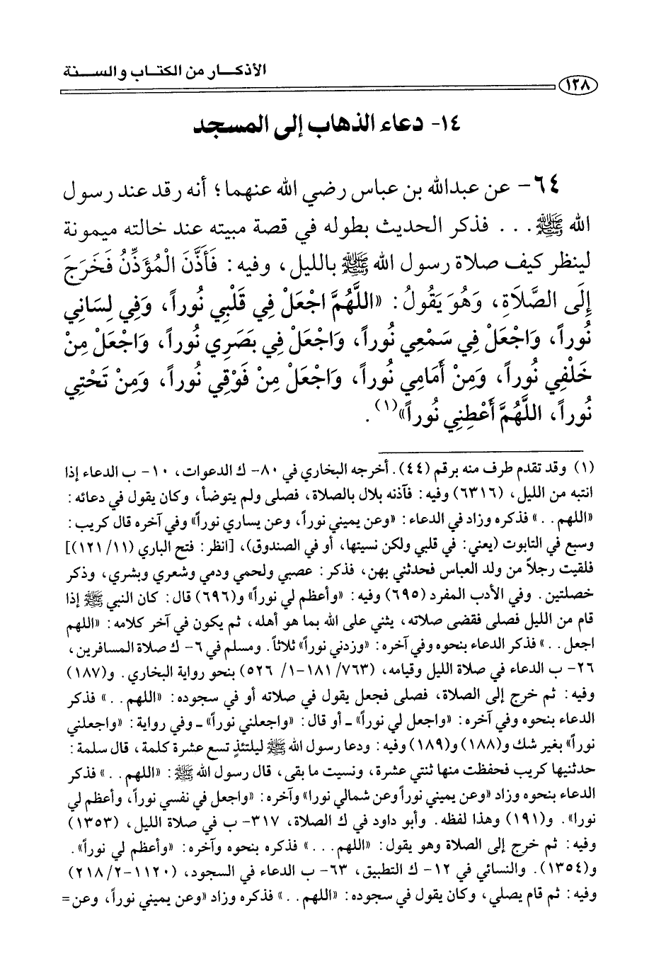 ٦٤ - عَنْ عبد الله بن عباس رضي الله عنهما؛ إِنَّهُ رقد عند رسول الله صلى الله عليه وسلم ... فذكر الحديث بطوله فِي قصة مبيته عند خالته ميمونه لينظر كيف صلاة رسول الله صلى الله عليه وسلم بالليل، وفيه: فَأَذَّنَ الْمُؤذِّنُ فَخَرَجَ إِلَى الصَّلَاةِ، وَهُوَ يَقُولُ: «اللَّهُمَّ اجْعَلْ فِي قَلْبِي نُورًا، وَفِي لِسَانِي نُورًا، وَاجْعَلْ فِي سَمْعِي نُورًا، وَاجْعَلْ فِي بَصَرِي نُورًا، وَاجْعَلْ مِنْ خَلْفِي نُورًا، وَمِنْ أَمَامِي نُورًا، وَاجْعَلْ مِنْ فَوْقِي نُورًا، وَمِنْ تَحْتِي نُورًا. اللَّهُمَّ أَعْطِنِي نُورًا» (¬١).