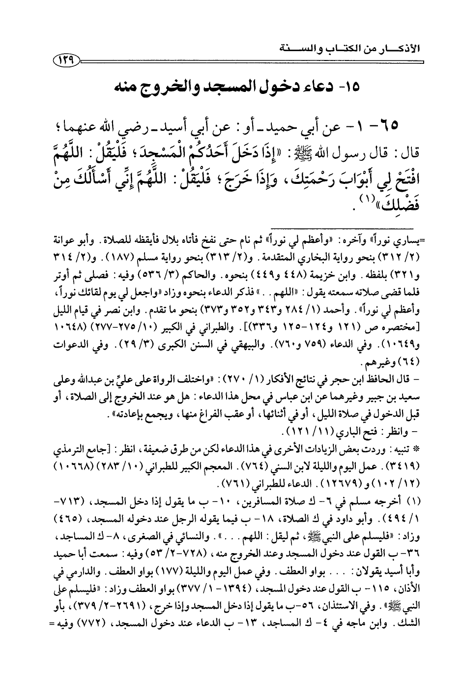 ٦٥ - ١ - عَنْ أبي حميد- أو: عَنْ أبي أسيد- رضي الله عنهما؛ قَالَ: قَالَ رسول الله صلى الله عليه وسلم: «إِذَا دَخَلَ أَحَدُكُمْ الْمَسْجِدَ؛ فَلْيَقُلْ: اللَّهُمَّ افْتَحْ لِي أَبْوَابَ رَحْمَتِكَ، وَإِذَا خَرَجَ؛ فَلْيَقُلْ: اللَّهُمَّ إِنِّي أَسْأَلُكَ مِنْ فَضْلِكَ» (¬١).