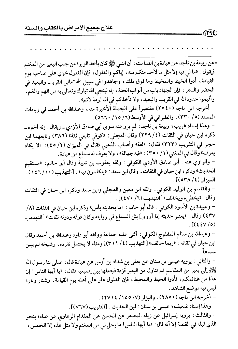 - والثاني: يرويه عيسى بن سنان عن يعلى بن شداد بن أوس عن عبادة قال: صلى بنا رسول الله صلى الله عليه وسلم إلى بعير من المقاسم ثم تناول من البعير قردة فجعلها بين إصبعيه فقال: «يا أيها الناس! إن هذا من غنائمكم، فأدوا الخيط والمخيط، فإن الغلول عار على أهله يوم القيامة، وشنار ونار» ليس فِيهِ موضعا الشاهد.