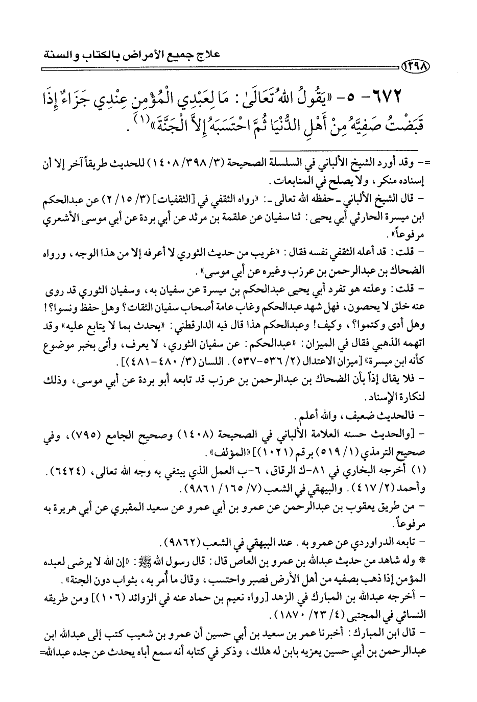 ٦٧٢ - ٥ - «يَقُولُ اللهُ تَعَالَى: مَا لِعَبْدِي الْمُؤْمِن عِنْدِي جَزَاءٌ إِذَا قَبَضْتُ صَفِيَّةُ مِنْ أَهْلِ الدُّنْيَا ثُمَّ احْتَسَبَهُ إِلَاّ الجَنَّةَ» (¬١) .