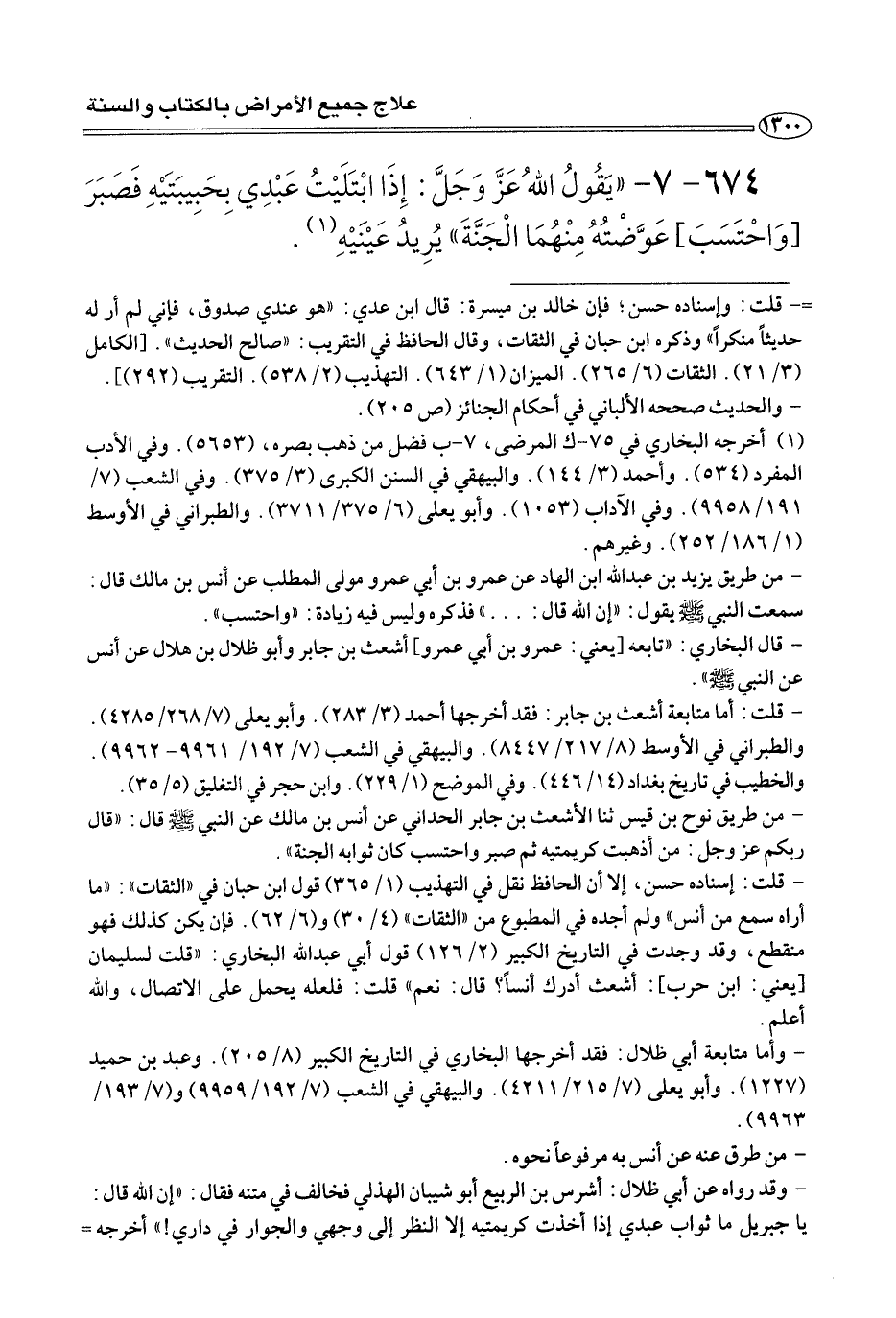 ٦٧٤ - ٧ - «يَقُولُ اللهُ عَزَّ وَجَلَّ: إِذَا ابْتَلَيْتُ عَبْدِيِ بِحَبِيبَتَيْهِ فَصَبَرَ [وَاحْتَسَبَ] عَوَّضْتُهُ مِنْهُمَا الْجَنَّةَ» يُرِيدُ عَيْنَيْهِ (¬١) .