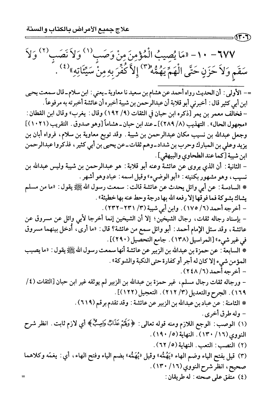 ٦٧٧ - ١٠ - «مَا يُصِيبُ الْمُؤْمِنَ مِنْ وَصَبٍ (¬١) وَلَا نَصَبٍ (¬٢) وَلَا سَقَمٍ وَلَا حَزَنٍ حَتَّى الْهَمَّ يَهُمُّهُ (¬٣) إِلَاّ كُفِّرَ بِهِ مِنْ سَيِّئَاتِهِ» (¬٤) .