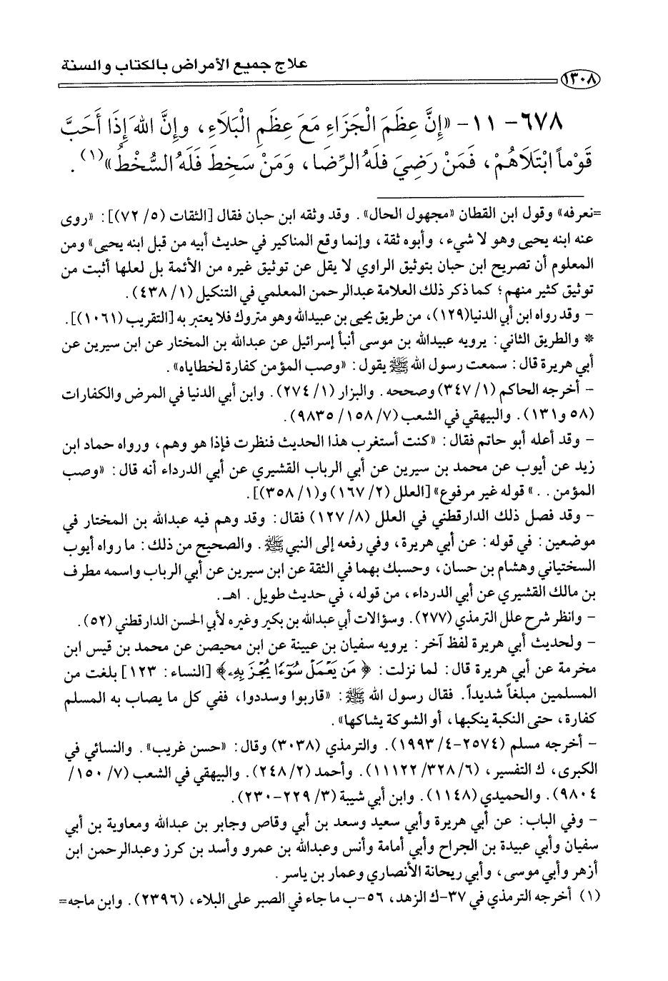 ٦٧٨ - ١١ - «إِنَّ عِظَمِ الْجَزَاءِ مَعَ عِظَمِ َمَع عِظَمِ الْبَلَاءِ، وإِنَّ اللهَ إِذَا أَحَبَّ قَوْمًا ابْتَلَاهُمْ، فَمَنْ رَضيَ فلَهُ الرِّضَا، وَمِنَ سَخِطَ فَلَهُ السُّخْطُ» (¬١) .