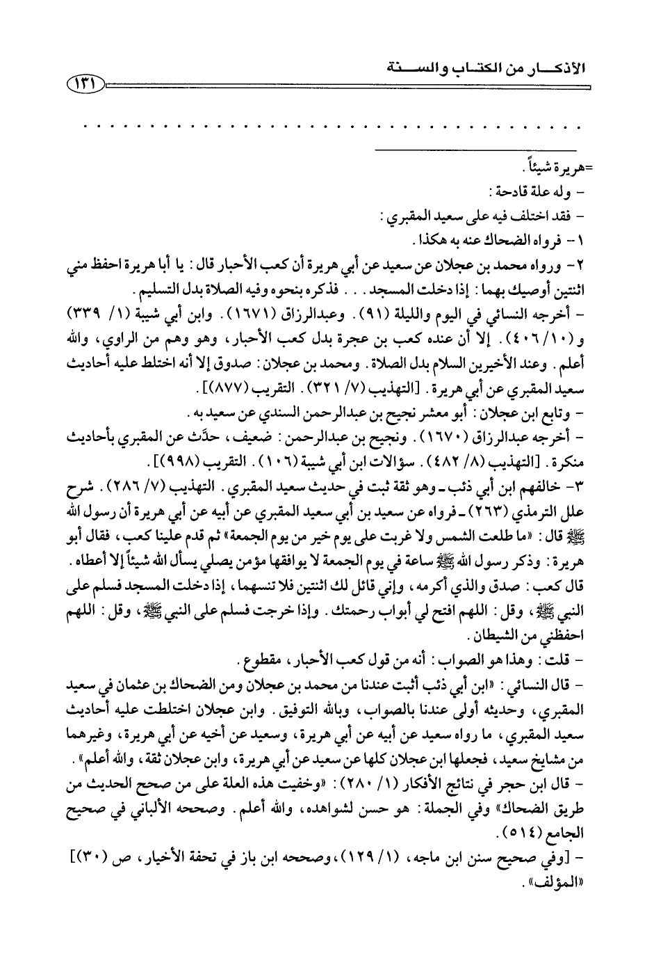 - خالفهم ابن أبي ذئب- وهو ثقة ثبت في حديث سعيد المقبري. التهذيب (٧/ ٢٨٦). شرح علل الترمذي (٢٦٣) - فرواه عن سعيد بن أبي سعيد المقبري عن أبيه عن أبي هريرة أن رسول الله صلى الله عليه وسلم قال: «ما طلعت الشمس ولا غربت على يوم خير من يوم الجمعة «ثم قد علينا كعب، فقال أبو هريرة: وذكر رسول الله صلى الله عليه وسلم ساعة في يوم الجمعة لا يوافقها مؤمن يصلى يسأل الله شيئا إلا أعطاه. قال كعب: صدق والذي أكرمه، وإني قائل لك اثنتين فلا تنسهما، وإذا دخلت المسجد فسلم على النبي صلى الله عليه وسلم، وقل: اللهم أفتح لي أبواب رحمتك. وإذا خرجت فسلم على النبي صلى الله عليه وسلم، وقل: اللهم احفظني من الشيطان.