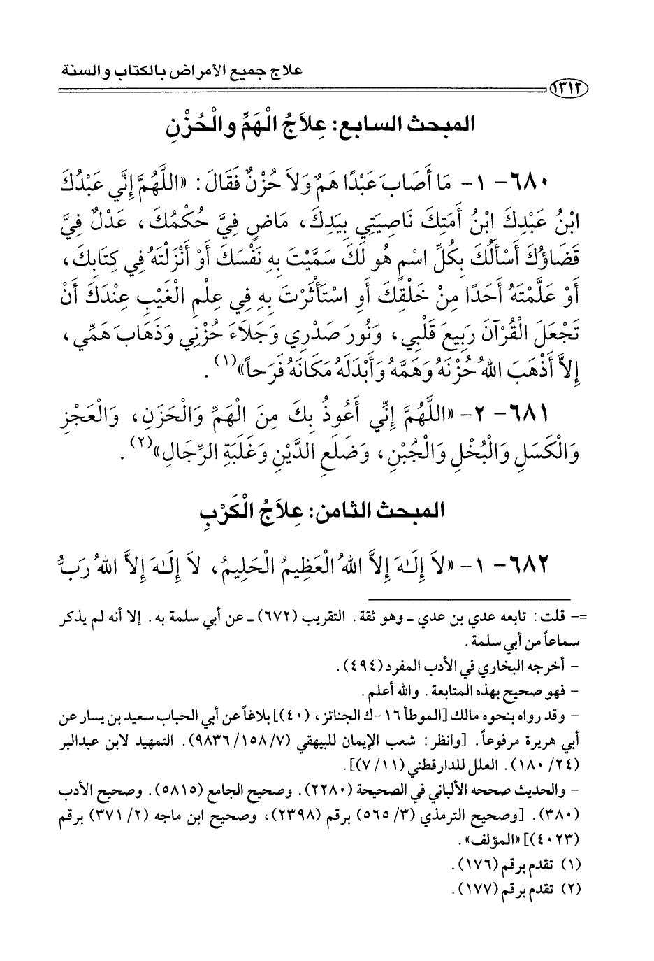 ٦٨٠ - ١ - مَا أَصَابَ عَبْدًا هَمٌ وَلَا خُزْنٌ فَقَالَ: «اللَّهُمَّ إِنَّي عَبْدُكَ ابْنُ عَبْدِكَ ابْنُ أَمَتِكَ نَاصِيَتِي بِيَدِكَ، مَاضٍ فِيَّ حُكْمُكَ، عَدْلٌ فِيَّ قَضَاؤُكَ أَسْأَلُكَ بِكُلِّ اسْمٍ هُوَ لَكَ سَمَّيْتَ بِهِ نَفْسَكَ أَوْ أَنْزَلْتَهُ فِي كِتَابِكَ، أَوْ عَلَّمْتَهُ أَحَدًا مِنْ خَلْقِكَ أَوْ اسْتَأَثَرْتَ بِهِ فِي عِلْمِ الْغَيْبِ عِنْدَكَ أَنْ تَجْعَلَ الْقُرْآنِ رَبِيعَ قَلْبِي، وَنُورَ صَدْرِي وَجَلَاءَ حُزْنِي وَذَهَابَ هَمِّي، إِلَاّ أَذْهَبَ اللهُ حُزْنَهُ وَهَمَّهُ وَأَبْدَلَهُ مَكَانَهُ فَرَحًا» (¬١).