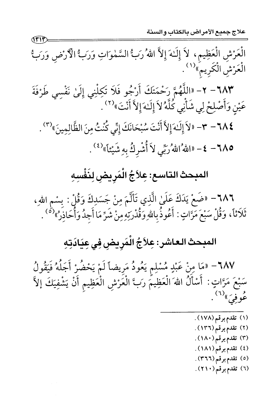 ٦٨٧ - «مَا مِنْ عَبْدٍ مُسْلِمٍ يَعُودُ مَرِيضًا لَمْ يَحْضُرْ أَجَلُهُ فَيَقُولُ سَبْعَ مَرَّاتٍ: أَسْأَلُ اللهَ الْعَظِيمَ رَبَّ الْعَرشْ ِالْعَظيِم ِأَنَّ يَشْفِيَكَ إِلَاّ عُوفِيَ» (¬٦).