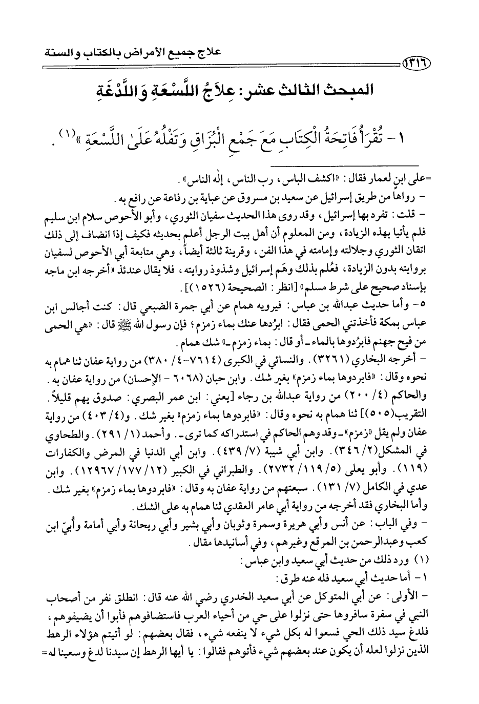 ١ - تُقْرَأُ فَاتِحَةُ الْكِتَابِ مَعَ جَمْعِ الْبُزَاقِ وَتَفْلُهُ عَلَى اللَّسْعَةِ» (¬١)
