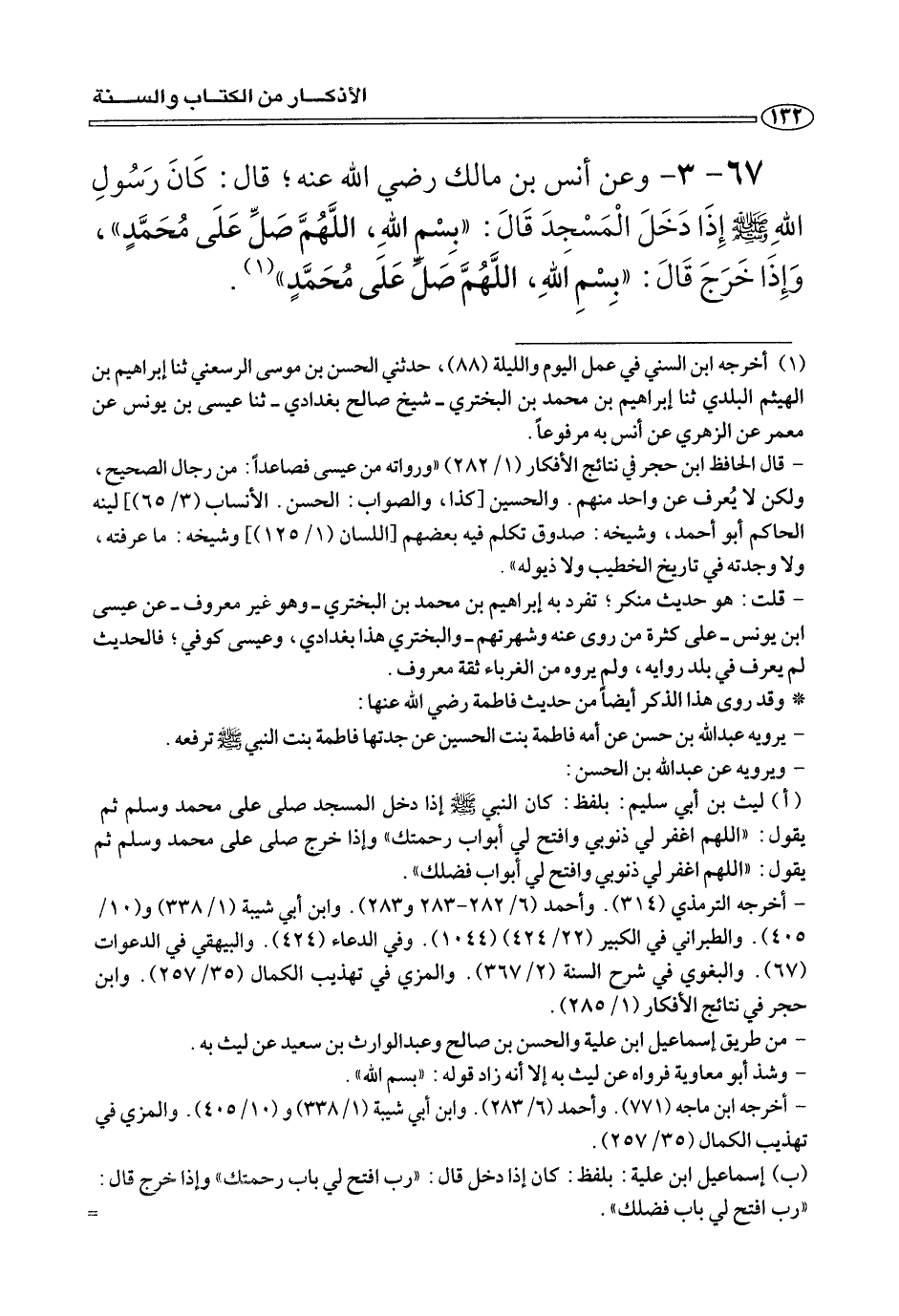 ٦٧ - ٣ - وعن أنس بن مالك رضي الله عنه؛ قَالَ: كَانَ إِذَا دخلَ المسجدَ قَالَ، «بِسْمِ اللَّهِ، اللَّهُمَّ صلِّ عَلَى مُحَمَّدٍ»، وَإِذَا خرجَ قَالَ: «بِسْمِ اللَّهِ، اللَّهُمَّ صَلِّ عَلَى مُحَمَّدٍ» (¬١) .