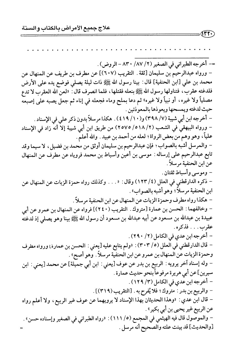 - قال الدارقطني في العلل (٥/ ٣٠٣): «ولم يتابع عليه] يعني: الحسن بن عمارة [ورواه مطرف وحمزة الزيات عن المنهال بن عمرو عن ابن الحنفية مرسلًا. وهو أصح».