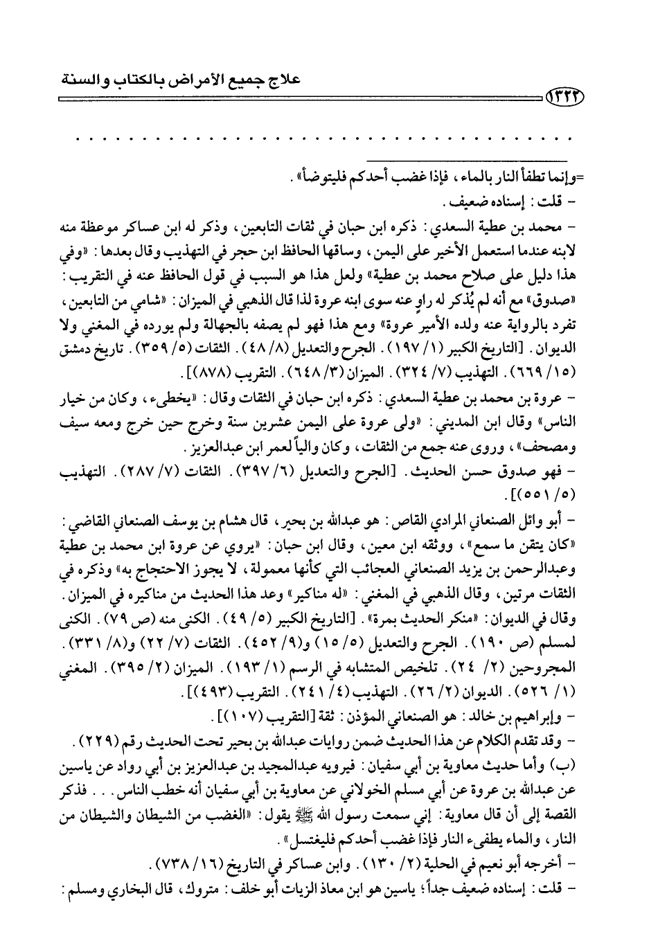 (ب) وأما حديث معاوية بن أبي سفيان: فيرويه عبد المجيد بن عبد العزيز بن أبي رواد عن ياسين عن عبد الله بن عروة عن أبي مسلم الخولاني عن معاوية بن أبي سفيان أنه خطب الناس ... فذكر القصة إلى أن قال معاوية: إني سمعت رسول الله صلى الله عليه وسلم يقول: «الغضب من الشيطان والشيطان من النار، والماء يطفئ النار فإذا غضب أحدكم فليغتسل».