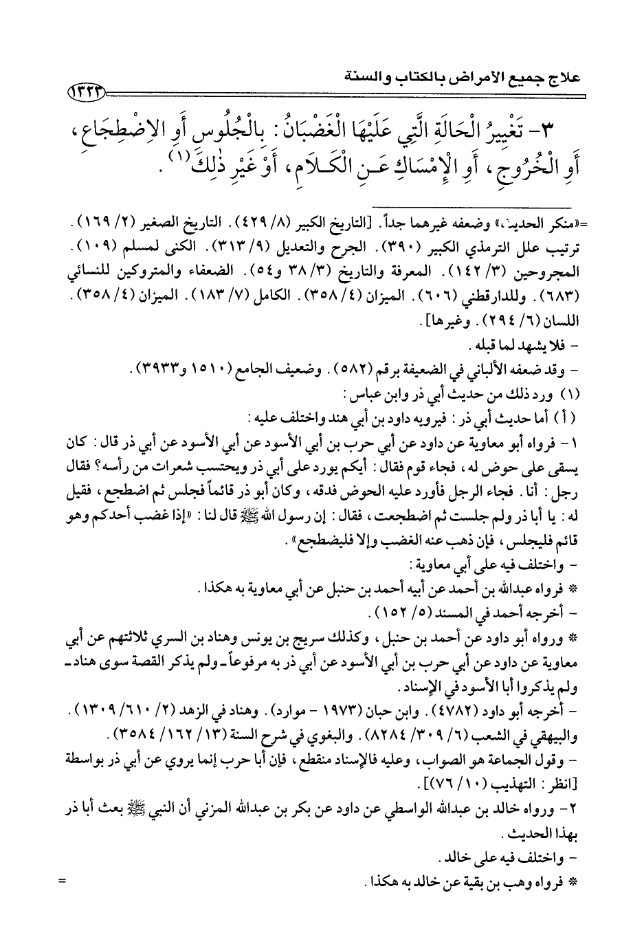١ - فرواه أبو معاوية عن داود عن أبي حرب بن أبي الأسود عن أبي الأسود عن أبي ذر قال: كان يسقى على حوض له، فجاء قوم فقال: أيكم يورد على أبي ذر ويحتسب شعرات من رأسه؟ فقال رجل: أنا. فجاء الرجل فأورد عليه الحوض فدقه، وكان أبو ذر قائمًا فجلس ثم اضطجع، فقيل له: يا أبا ذر ولم جلست ثم اضطجعت، فقال: إن رسول الله صلى الله عليه وسلم قال لنا: «إذا غضب أحدكم وهو قائم فليجلس، فإن ذهب عنه الغضب وإلا فليضطجع».