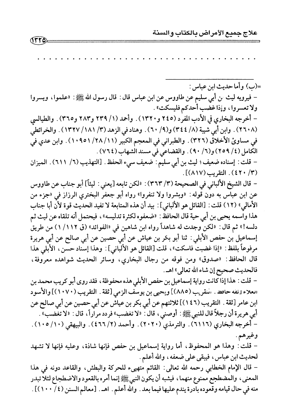 - قال الشيخ الألباني في الصحيحة (٣/ ٣٦٣): «لكن تابعه] يعني: ليثًا [أبو جناب عن طاووس عن ابن عباس به دون قوله: «وبشروا لا وتنفروا» رواه أبو جعفر البختري الرزاز في «جزء من الأمالي» (١٢) قلت:] القائل هو الألباني [: بيد أن هذه المتابعة لا تفيد الحديث قوة لأن أبا جناب هذا واسمه يحيى بن أبي حية قال الحافظ: «ضعفوه لكثرة تدليسه»، فيحتمل أنه تلقاء عن ليث ثم دلسه!» ثم قال: «لكن وجدت له شاهدًا رواه ابن شاهين في «الفوائد» (ق ١١٢/ ١) من طريق إسماعيل بن حفص الأبلي: ثنا أبو بكر بن عياش عن أبي حصين عن أبي صالح عن أبي هريرة مرفوعًا بلفظ: «إذا غضبت فاسكت»، قلت] القائل هو الألباني [: وهذا إسناد حسن، الألبي هذا قال الحافظ: «صدوق» ومن فوقه من رجال البخاري، وسائر الحديث شواهده معروفة، فالحديث صحيح إن شاء الله تعالى» أهـ.