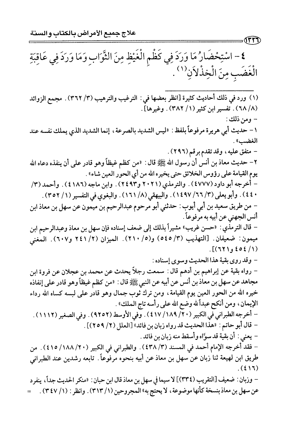 ٢ - حديث معاذ بن أنس أن رسول الله صلى الله عليه وسلم قال: «من كظم غيظًا وهو قادر على أن ينفذه دعاه الله يوم القيامة على رؤوس الخلائق حتى يخيره الله من أي الحور العين شاء».