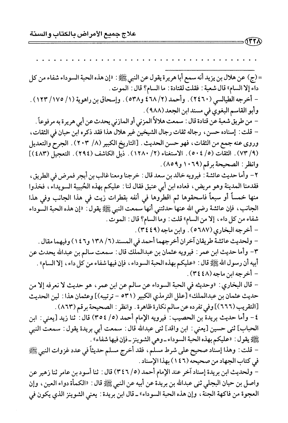 = (ج) عن هلال بن يزيد أنه سمع أبا هريرة يقول عن النبي صلى الله عليه وسلم: «إن هذه الحبة السوداء شفاء من كل داء إلا السام» قال شعبة: فقلت لقتادة: ما السام؟ قال: الموت.