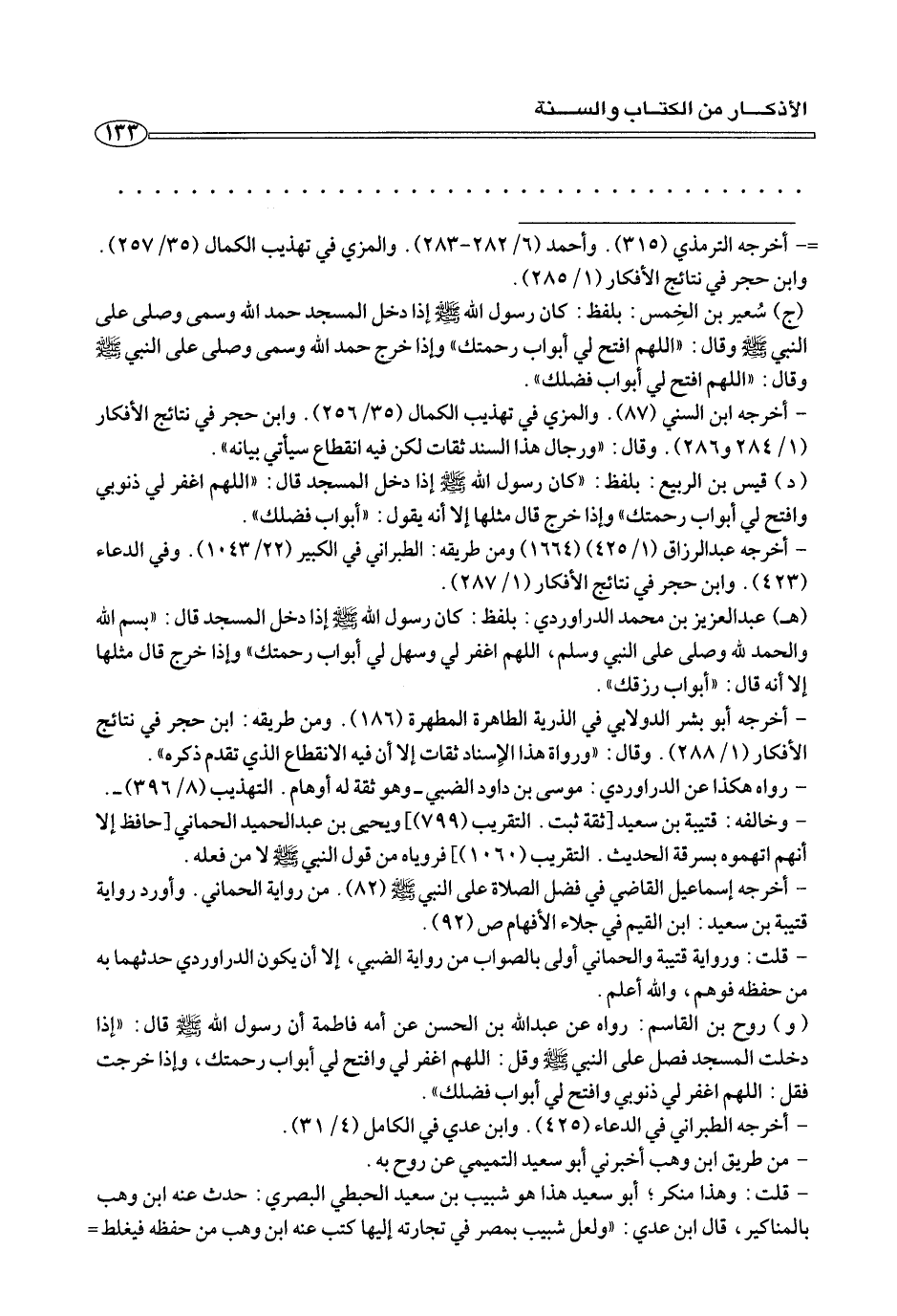 (ه) عبد العزيز بن محمد الدراوردي: بلفظ: كان رسول الله صلى الله عليه وسلم إذا دخل المسجد قال: «بسم الله والحمد لله وصلى على النبي وسلم، اللهم أغفر لي وسهل لي أبواب رحمتك «وإذا خرج قال مثلها إلا أنه قال: «أبواب رزقك».