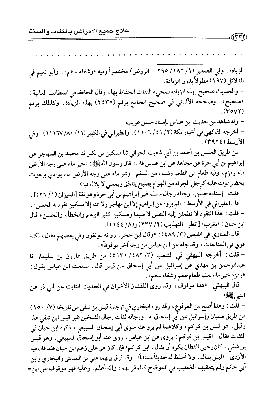 - قلت: أخرجه البيهقي في الشعب (٣/ ٤٨٢/٤١٣٠) من طريق هارون بن سليمان نا عبد الرحمن بن مهدي عن إسرائيل عن أبي إسحاق عن قيس قال: سمعت ابن عباس يقول: «زمزم خير ماء يعلم طعام وشفاء سقم».