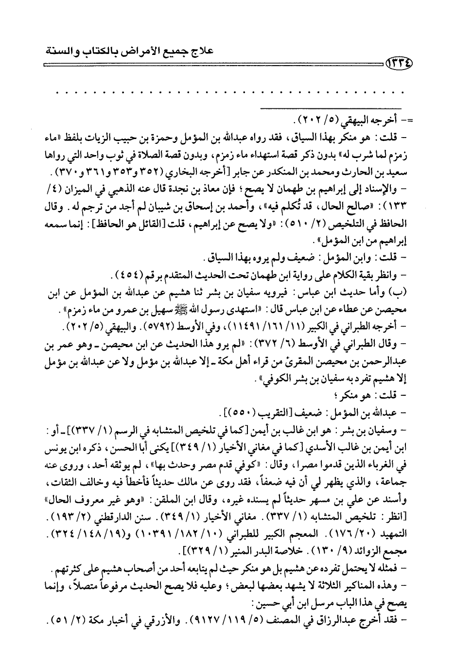 (ب) وأما حديث ابن عباس: فيرويه سفيان بن بشر ثنا هشيم عن عبد الله بن المؤمل عن ابن محيصن عن عطاء عن ابن عباس قال: «استهدى رسول الله صلى الله عليه وسلم سهيل بن عمرو من ماء زمزم».