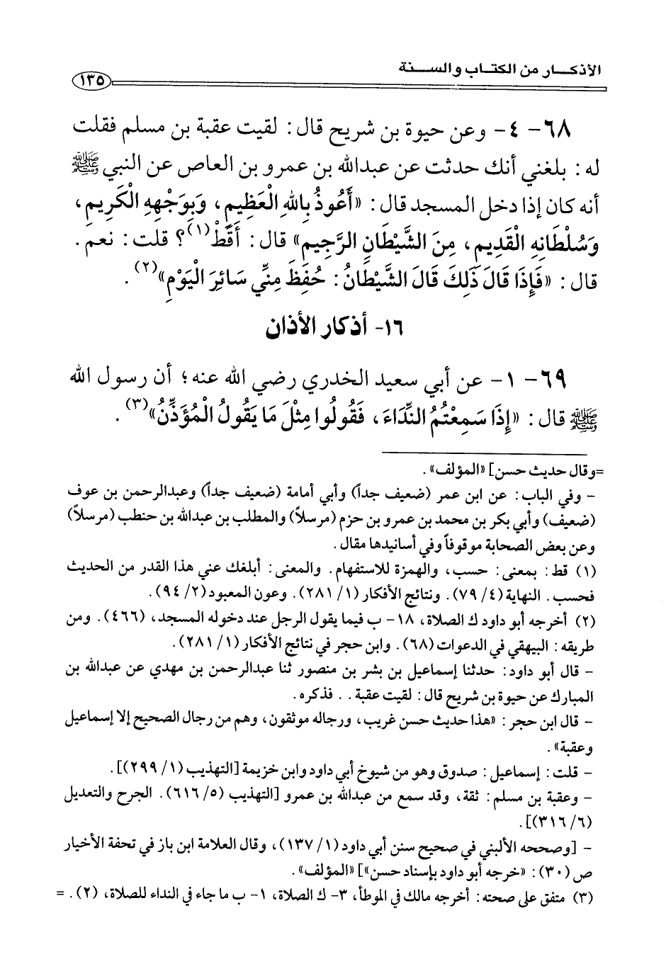 ٦٨ - ٤ - وعن حيوة بن شريح قَالَ: لقيتُ عقبةَ بنَ مسلمٍ فقلتُ لَهُ: بلغني أنَّك حدَّثتَ عَنْ عبدِ اللهِ بنِ عمرِو بنِ العاصِعن النبي اللهِ صلى الله عليه وسلم إِنَّهُ كَانَ إذا دخل المسجد قال: «أَعُوذُ بِاللهِ الْعَظِيمِ وَبِوَجْهِهِ الْكَرِيمِ وَسُلْطَانِهِ الْقَدِيِمِ، مِنَ الشَّيْطَانِ الرَّجيمِ» قَالَ: أقطّ (¬١)؟ قلتُ: نعم قَالَ: «فَإِذَا قَالَ ذَلِكَ قَالَ الشَّيْطَانُ: حُفِظَ مِنِّي سَائِرَ الْيَوْمِ» (¬٢).