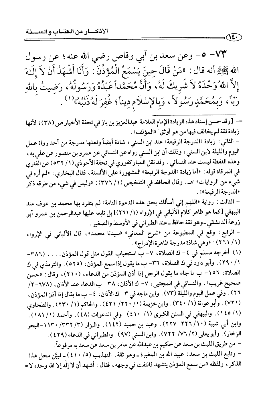 ٧٣ - ٥ - وعن سعد بن أبي وقاص رضي الله عنه؛ عَنْ رسول الله صلى الله عليه وسلم صلى الله عليه وسلم إِنَّهُ قَالَ: «مَنْ قَالَ حِينَ يَسْمَعُ الْمُؤَذِّنَ: وَأَنَا أَشْهَدُ أَنْ لَا إِلَهَ إِلَاّ اللَّهُ وَحْدَهُ لَا شَرِيكَ لَهُ، وَأَنَّ مُحَمَّدًا عَبْدُهُ وَرَسُولُهُ، رَضِيتُ بِاللَّهِ ربا، وَبِمُحَمَّدٍ رَسُولًا، وَبِالإِسْلَامِ دِينًا؛ غُفِرَ لَهُ ذَنْبُهُ» (¬١) .