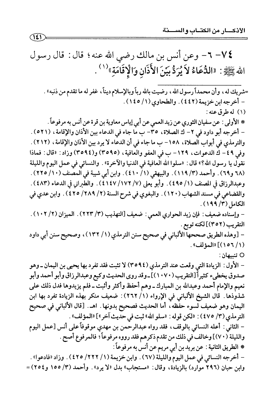 ٧٤ - ٦ - وعن أنس بن مالك رضي الله عنه؛ قَالَ: قَالَ رسول الله صلى الله عليه وسلم: «الدُّعَاءُ لَا يُرَدُّ بَيْنَ الأَذَانِ وَالْإِقَامَةِ» (¬١) .