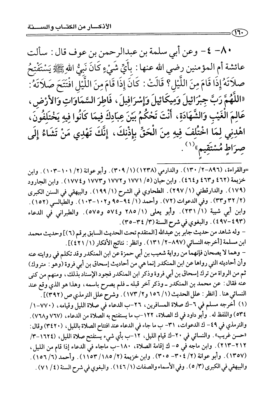 ٨٠ - ٤ - وعن أبي سلمة بن عبد الرحمن بن عوف قَالَ: سألت عاشة أم المؤمنين رضي الله عنها: بِأَيِّ شَيْءٍ كَانَ نَبِيُّ اللهِ صلى الله عليه وسلم يَسْتَفْتِحُ صَلَاتَهُ إِذَا قَامَ مِنْ اللَّيْلِ؟ قَالَتْ: كَانَ إِذَا قَامَ مِنَ اللَّيْلِ افْتَتَحَ صَلَاتَهُ: «اللَّهُمَّ رَبَّ جِبْرَائِيلَ وَمِيكَائِيلَ وَإِسْرَافِيلَ، فَاطِرَ السَّمَاوَاتِ وَالأرْضِ، عَالِمَ الْغَيْبِ وَالشَّهَادَةِ، أَنْتَ تَحْكُمُ بَيْنَ عِبَادِكَ فِيمَا كَانُوا فِيهِ يَخْتَلِفُونَ، اهْدِنِي لِمَا اخْتُلِفَ فِيهِ مِنَ الْحَقِّ بِإِذْنِكَ، إِنَّكَ تَهْدِي مَنْ تَشَاءُ إِلَى صِرَاطٍ مُسْتَقِيمٍ» (¬١) .