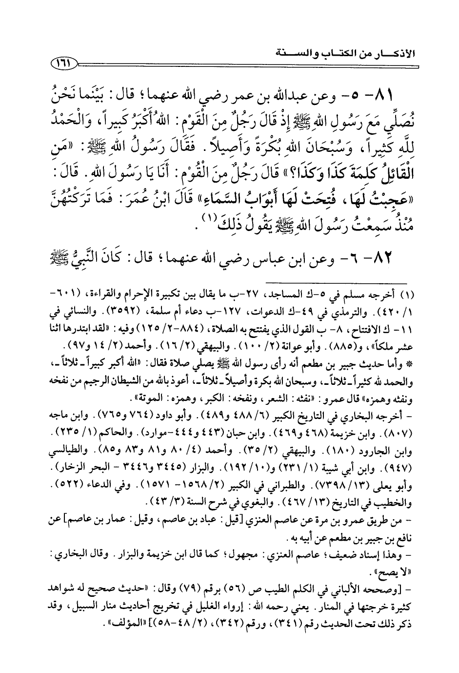 ٨١ - ٥ - وعن عبد الله بن عمر رضي الله عنهما؛ قَالَ: بَيْنَما نَحْنُ نُصَلِّيِ مَعَ رَسُولِ اللهِ صلى الله عليه وسلم إِذَا قَالَ رَجُلٌ مِنْ الْقَوْمِ: اللهَ أَكْبَرُ كَبِيرًا، وَالْحَمْدُ لِلَّهِ كَثِيرًا، وَسُبْحَانَ اللهِ بُكْرَةً وَأَصِيلًا. فَقَالَ رَسُولُ اللهِ صلى الله عليه وسلم: «مَنِ الْقَائِلُ كَلِمَةَ كَذَا وَكَذَا؟» قَالَ رَجُلٌ مِنَ الْقُوْمِ: أَنَا يَا رَسُولَ اللهِ. قَالَ: «عَجِبْتُ لَهَا، فُتِحَتْ لَهَا أَبْوَابُ السَّمَاءِ» قَالَ ابْنُ عُمَرَ: فَمَا تَرَكْتُهُنَّ مُنْذُ سَمِعْتُ رَسُولَ اللهِ صلى الله عليه وسلم يَقُولُ ذِلِكَ (¬١) .