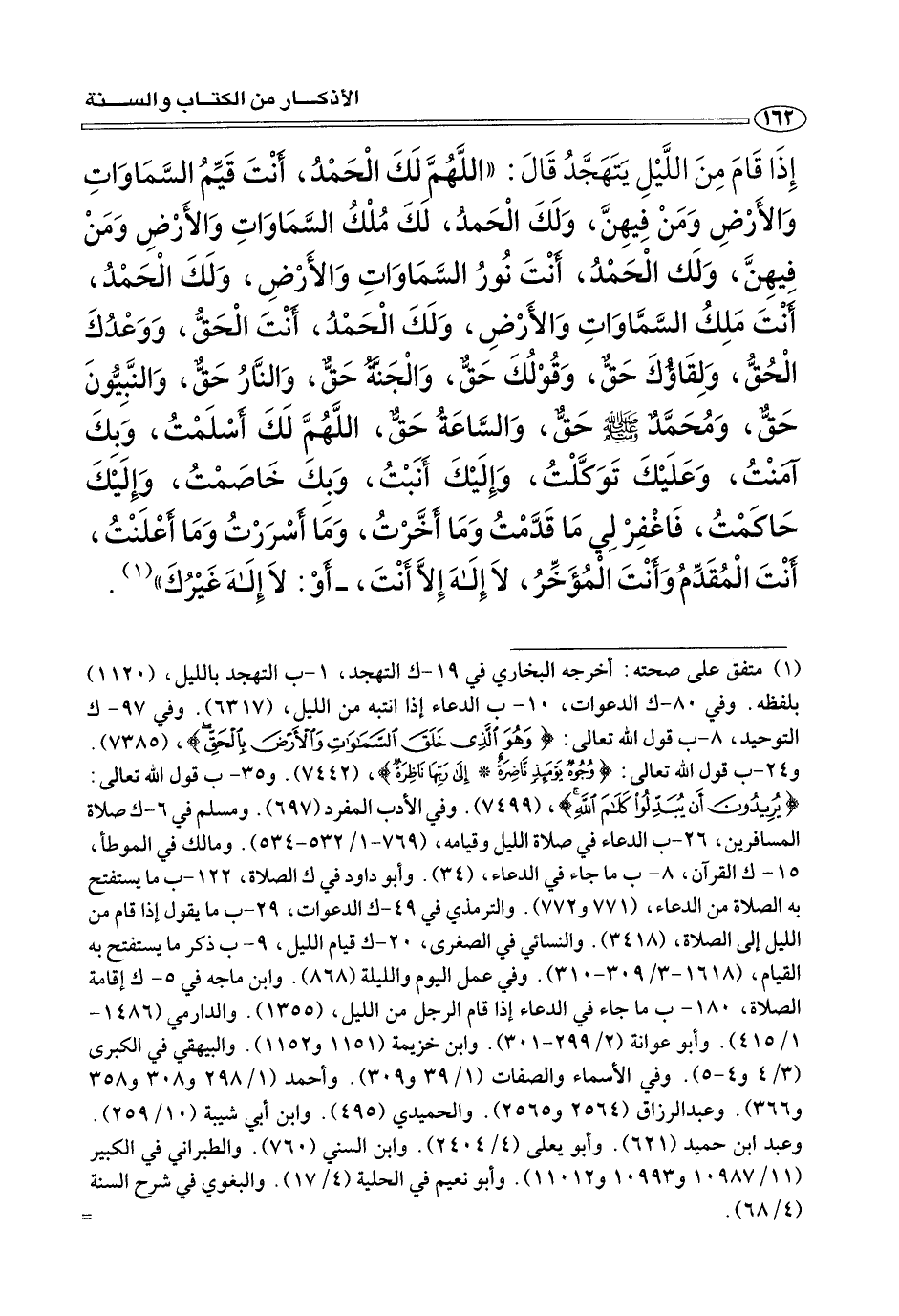 (¬١) متفق علي صحته: أخرجه البخاري في ١٩ - ك التهجد، ١ - ب التهجد بالليل، (١١٢٠) بلفظه وفي ٨٠ - ك الدعوات، ١٠ - ب الدعاء إذا انتبه من الليل، (٦٣١٧) وفي ٩٧ - ك التوحيد، ٨ - ب قول الله تعالى: {وَهُوَ الَّذِي خَلَقَ السَّمَاوَاتِ وَالْأَرْضَ بِالْحَقِّ}، (٧٣٨٥) و ٢٤ - ب قول الله تعالى: {وُجُوهٌ يَوْمَئِذٍ نَاضِرَةٌ * إِلَى رَبِّهَا نَاظِرَةٌ}، (٧٤٤٢) و ٣٥ - ب قول الله تعالى: {يُرِيدُونَ أَنْ يُبَدِّلُوا كَلَامَ اللَّهِ} (٧٤٩٩) وفي الأدب المفرد (٦٩٧). ومسلم في ٦ - ك صلاة المسافرين، ٢٦ - ب الدعاء في صلاة الليل وقيامه، (٧٦٩ - ١/ ٥٣٢ - ٥٣٤). ومالك في الموطأ، ١٥ - ك القرآن، ٨ - ب ما جاء في الدعاء، (٣٤) وأبو داود في ك الصلاة، ١٢٢ - ب ما يستفتح به الصلاة من الدعاء، (٧٧١ و ٧٧٢). والترمذي في ٤٩ - ك الدعوات، ٢٩ - ب ما يقول إذا قام من الليل إلي الصلاة، (٣٤١٨) والنسائي في الصغرى، ٢٠ - ك قيام الليل، ٩ - ب ذكر ما يستفتح به القيام، (١٦١٨ - ٣/ ٣٠٩ - ٣١٠) في عمل اليوم والليلة (٨٦٨) وابن ماجه في ٥ - ك إقامة الصلاة، ١٨٠ - ب ما جاء في الدعاء إذا قام الرجل من الليل، (١٣٥٥). والدارمي (١٤٨٦ - ١/ ٤١٥) وأبو عوانة (٢/ ٢٩٩ - ٣٠١) وابن خزيمة (١١٥١ و ١١٥٢) والبيهقي في الكبرى (٣/ ٤ و ٤ - ٥) وفي الأسماء والصفات (١/ ٣٩ و ٣٠٩) وأحمد (١/ ٢٩٨ و ٣٠٨ و ٣٥٨ و ٣٦٦). وعبد الرزاق (٢٥٦٤ و ٢٥٦٥) والحميدي (٤٩٥) وابن أبي شيبه (١٠/ ٢٥٩). وعبد ابن حميد (٦٢١) وأبو يعلي (٤/ ٢٤٠٤) وابن السني (٧٦٠) والطبراني في الكبير (١١/ ١٠٩٨٧ و ١٠٩٩٣ و ١١٠١٢) وأبو نعيم في الحلية (٤/ ١٧). والبغوي في شرح السنة (٤/ ٦٨).