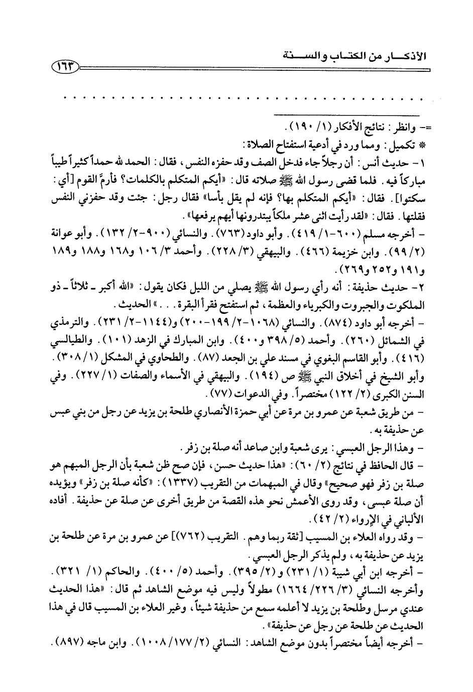 ١ - حديث أنس: أن رجلا جاء فدخل الصف وقد حفزه النفس، فقال: الحمد لله حمدا كثيرا طيبا مباركا فيه. فلما قضي رسول الله صلى الله عليه وسلم صلاته قال: «أيكم المتكلم بالكلمات؟ فأرم القوم] أي: سكتوا]. فقال: «أيكم المتكلم بها؟ فإنه لم يقل بأسا «فقال رجل: جئت وقد حفزني النفس فقلتها. فقال: «لقد رأيت اثني عشر ملكا يبتدرونها أيهم يرفعها».