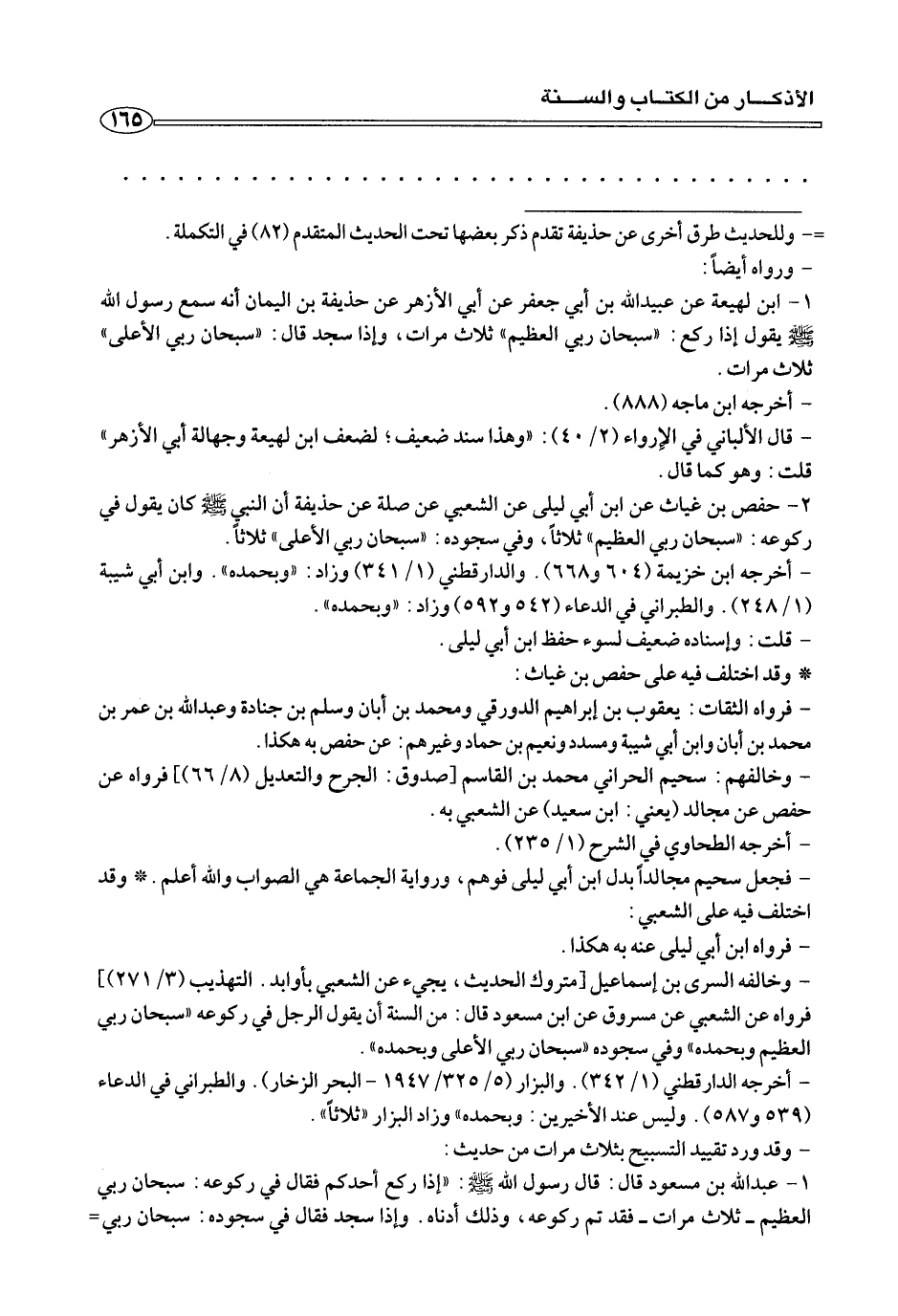 - وخالفه السري بن إسماعيل] متروك الحديث، يجئ عن الشعبي بأوابد. التهذيب (٣/ ٢٧١)]. فرواه عن الشعبي عن مسروق عن ابن مسعود قال: من السنة أن يقول الرجل في ركوعه «سبحان ربي العظيم وبحمده «وفي سجوده «سبحان ربي الأعلى وبحمده».