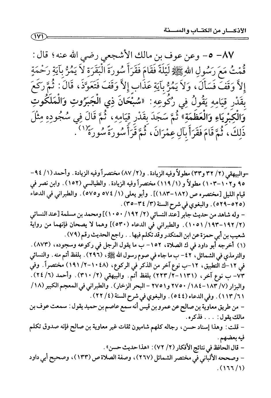 ٨٧ - ٥ - وعن عوف بن مالك الأشجعي رضي الله عنه؛ قَالَ: قُمْتُ مَعَ رَسُولِ اللهِ صلى الله عليه وسلم لَيْلَةً فَقَامَ فَقَرَأَ سُورَةَ الْبَقَرَةِ لَا يَمُرُّ بِآيَةِ رَحْمَةٍ إِلَاّ وَقَفَ فَسَأَلَ، وَلَا يَمُرُّ بِآيَةِ عَذَابٍ إِلَاّ وَقَفَ فَتَعَوَّذَ، قَالَ: ثُمَّ رَكَعَ بِقَدْرِ فِيَامِهِ يَقُولُ فِي رُكُوعِهِ: «سُبْحَانَ ذِي الْجَبَرُوتِ وَالْمَلَكُوتِ وَالْكِبْريَاءِ وَالْعَظَمَةِ» ثُمَّ سَجَدَ بِقَدْرِ قِيَامِهِ، ثُمَّ قَالَ فِي سُجُودِهِ مِثْلَ ذَلِكَ، ثُمَّ قَامَ فَقَرَأَ بِآلِ عِمْرَانَ، ثُمَّ قَرَأَ سُورَةً سُورَةً (¬١) .