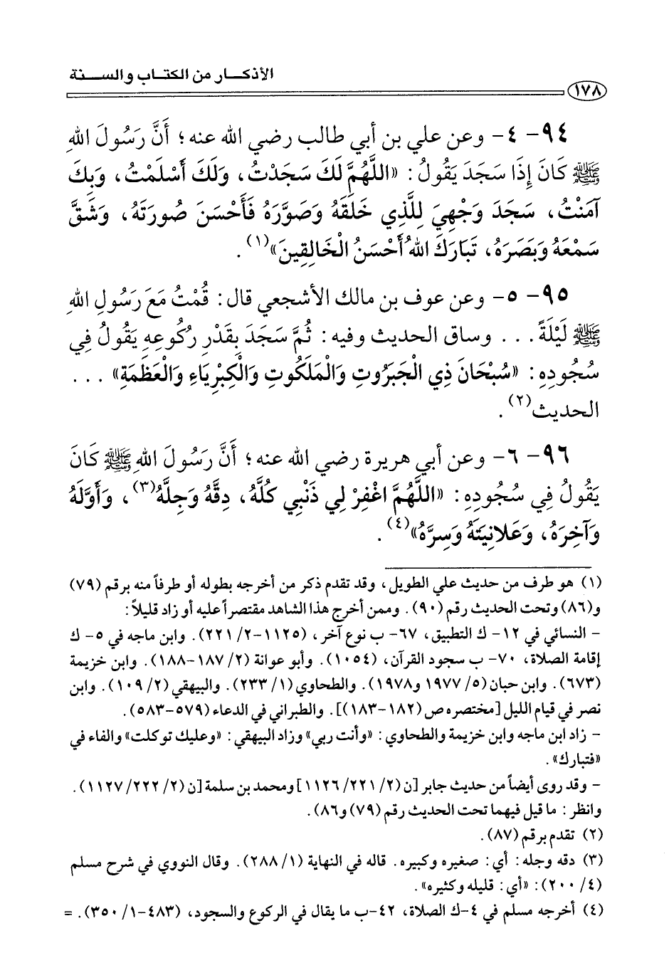 ٩٤ - ٤ - وعن علي بن أبي طالب رضي الله عنه؛ أَنَّ رَسُولَ اللهِ صلى الله عليه وسلم كَانَ إِذَا سَجَدَ يَقُولُ: «اللَّهُمَّ لَكَ سَجَدْتُ، وَلَكَ أَسْلَمْتُ، وَبِكَ آمَنْتُ، سَجَدَ وَجْهِيَ لِلَّذِي خَلَقَهُ وَصَوَّرَهُ فَأَحْسَنَ صُورَتَهُ، وَشَقَّ سَمْعَهُ وَبَصَرَهُ، تَبَارَكَ اللهُ أَحْسَنُ الْخَالِقِينَ» (¬١) .