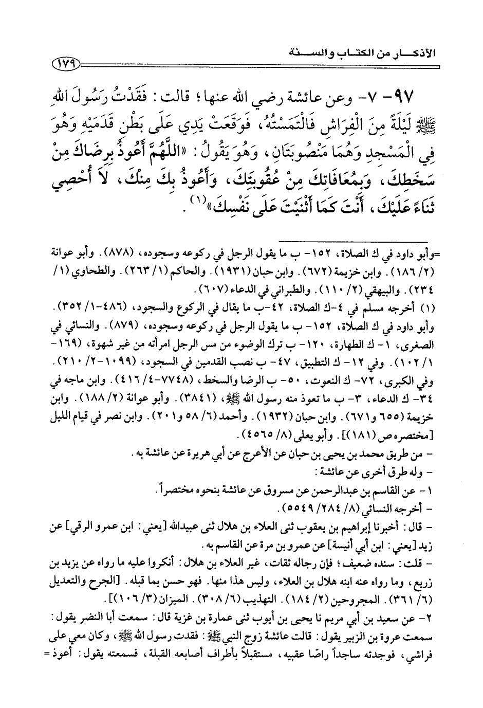 ٩٧ - ٧ - وعن عائشة رضي الله عنها؛ قَالَت: فَقَدْتُ رَسُولَ اللهِ صلى الله عليه وسلم لَيْلَةً مِنَ الْفِرَاشِ فَالْتَمَسْتُهُ، فَوَقَعَتْ يَدِي عَلَى بَطْنِ قَدَمَيْهِ وَهُوَ فِي الْمَسْجِدِ وَهُمَا مَنْصُوبَتَانِ، وَهُوَ يَقُولُ: «اللَّهُمَّ أَعُوذُ بِرِضَاكَ مِنْ سَخَطِكَ، وَبِمُعَافَاتِكَ مِنْ عُقُوبَتِكَ، وَأَعُوذُ بِكَ مِنْكَ، لَا أُحْصِي ثَنَاءً عَلَيْكَ، أَنْتَ كَمَا أَثْنَيْتَ عَلَى نَفْسِكَ» (¬١) .