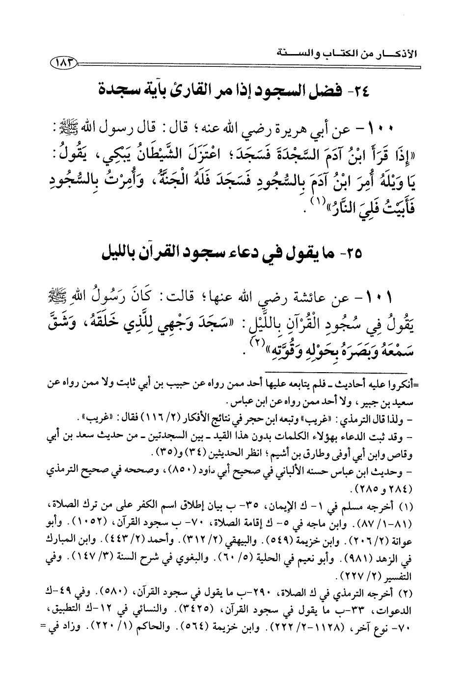 ١٠٠ - عَنْ أبي هريرة رضي الله عنه؛ قال: قَالَ رسول الله صلى الله عليه وسلم: «إِذَا قَرَأَ ابْنُ آدَمَ السَّجْدَةَ فَسَجَدَ؛ اعْتَزَلَ الشَّيْطَانُ يَبْكِي، يَقُولُ: يَا وَيْلَهُ أُمِرَ ابْنُ آدَمَ بِالسُّجُودِ فَسَجَدَ فَلَهُ الْجَنَّةُ، وَأُمِرْتُ بِالسُّجُودِ فَأَبَيْتُ فَلِيَ النَّارُ» (¬١).
