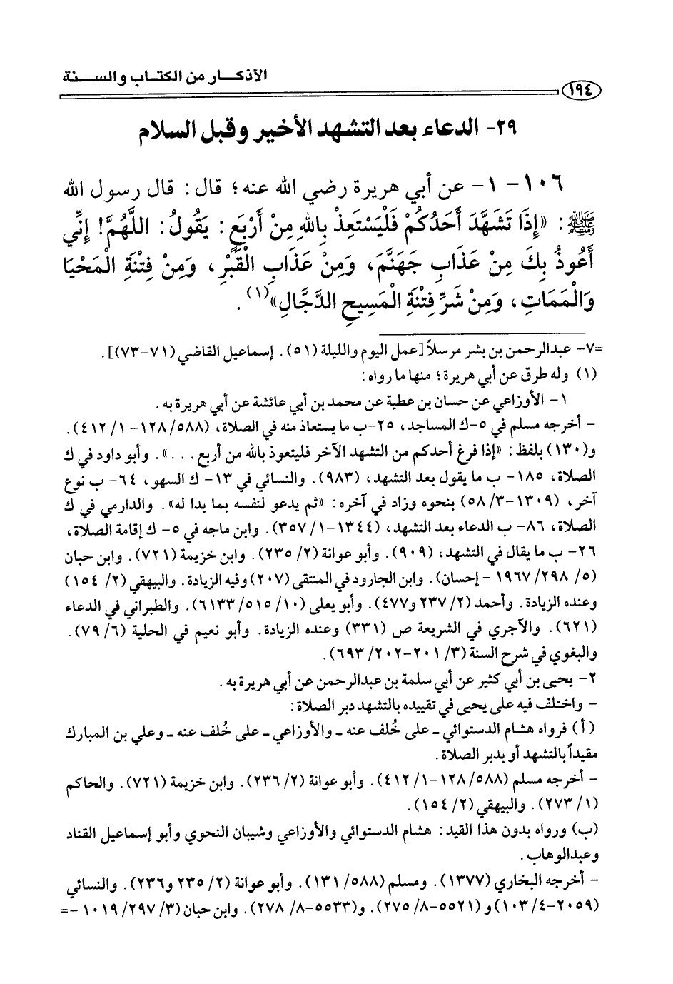 ١٠٦ - ١ - عَنْ أبي هريرة رضي الله عنه؛ قَالَ: قَالَ رسول الله صلى الله عليه وسلم: «إِذَا تَشَهَّدَ أَحَدُكُمْ فَلْيَسْتَعِذْ بِاللهِ مِنْ أَرْبَعٍ: يَقُولُ: اللَّهُمَّ! إِنِّي أَعُوذُ بِكَ مِنْ عَذَابِ جَهَنَّمَ، وَمِنْ عَذَابِ الْقَبْرِ، وَمِنْ فَتْنَةِ الْمَحْيَا وَالْمَمَاتِ، وَمِنْ شَرِّ فِتْنَةِ الْمَسِيحِ الدَّجَّالِ» (¬١).