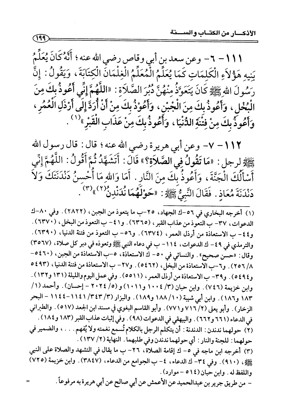 ١١١ - ٦ - وعن سعد بن أبي وقاص رضي الله عنه؛ أَنَّهُ كَانَ يُعَلِّمُ بَنِيهِ هَؤُلَاءِ الْكَلِمَاتِ كَمَا يُعَلِّمُ الْمُعَلِّمُ الْغِلْمَانَ الْكِتَابَةَ، وَيَقُولُ: إِنَّ رَسُولَ اللهِ صلى الله عليه وسلم كَانَ يَتَعَوَّذُ مِنْهُنَّ دُبُرَ الصَّلَاةِ: «اللَّهُمَّ إِنِّي أَعُوذُ بِكَ مِنَ البُخلِ، وَأَعُوذُ بِكَ مِنَ الجْبْن، ِ وَأَعُوذُ بِكَ مِنْ أَنْ أُردَّ إِلَى أَرْذَلِ الْعُمُرِ، وَأَعُوذُ بِكَ مِنْ فِتْنَةِ الدُّنْيَا، وَأَعُوذُ بِكَ مِنْ عَذَابِ الْقَبْرِ» (¬١).