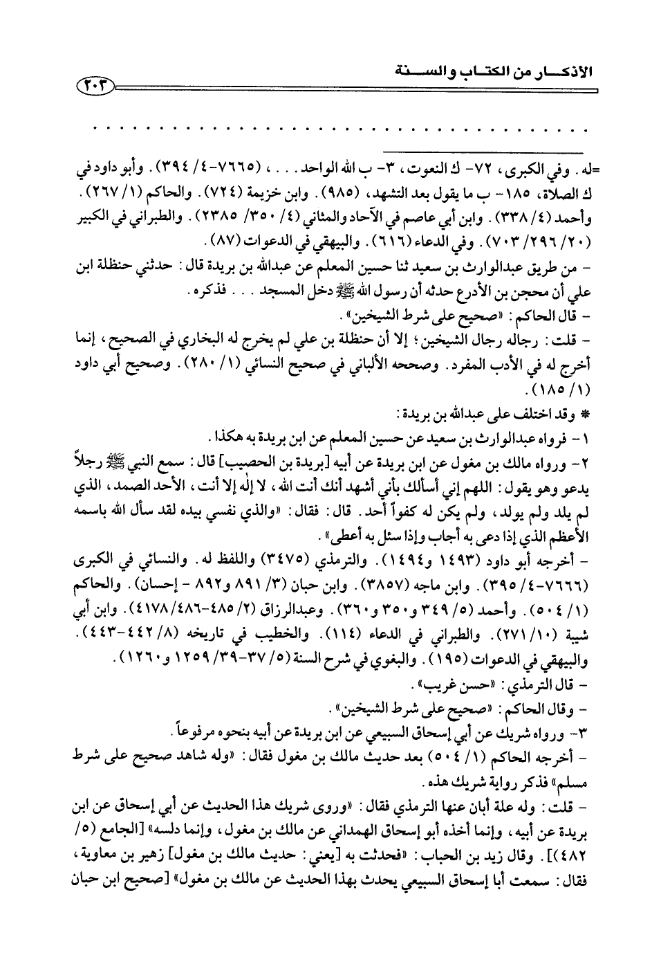 ٢ - ورواه مالك بن مغول عن ابن بريدة عن أبيه] بريدة بن الحسيب] قال: سمع النبي صلى الله عليه وسلم رجلًا يدعو وهو يقول: اللهم إني أسألك بأني أشهد أنك أنت الله، لا إله إلا أنت، الأحد الصمد، الذي لم يلد ولم يولد، ولم يكن له كفوًا أحد. قال: فقال: «والذي نفسي بيده لقد سأل الله باسمه الأعظم الذي إذا دعى به أجاب وإذا سئل به أعطى».