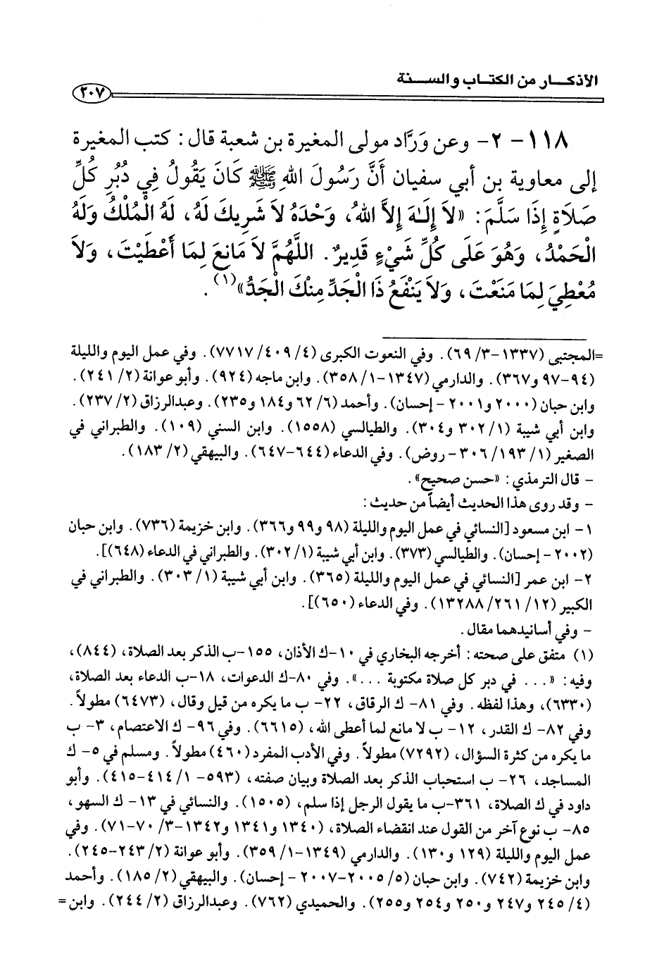١١٨ - ٢ - وعن وَرَّاد مولي المغيرة بن شعبة قَالَ: كتب المغيرة إلي معاوية إلي بن أبي سفيان أَنَّ رَسُولَ الله صلى الله عليه وسلم كَانَ يَقُولُ فِي دُبُرِ كُلِّ صَلَاةٍ إِذَا سَلَّمَ: «لَا إِلَهَ إِلَاّ اللهُ، وَحْدَهُ لَا شَرِيكَ لَهُ، لَهُ الْمُلْكُ وَلَهُ الْحَمْدُ، وَهُوَ عَلَى كُلِّ شَيْءٍ قَدِيرٌ. اللَّهُمَّ لَا مَانِعَ لِمَا أَعْطَيْتَ، وَلَا مُعْطِيَ لِمَا مَنَعْتَ، وَلَا يَنْفَعُ ذَا الْجَدِّ مِنْكَ الْجَدُّ» (¬١).