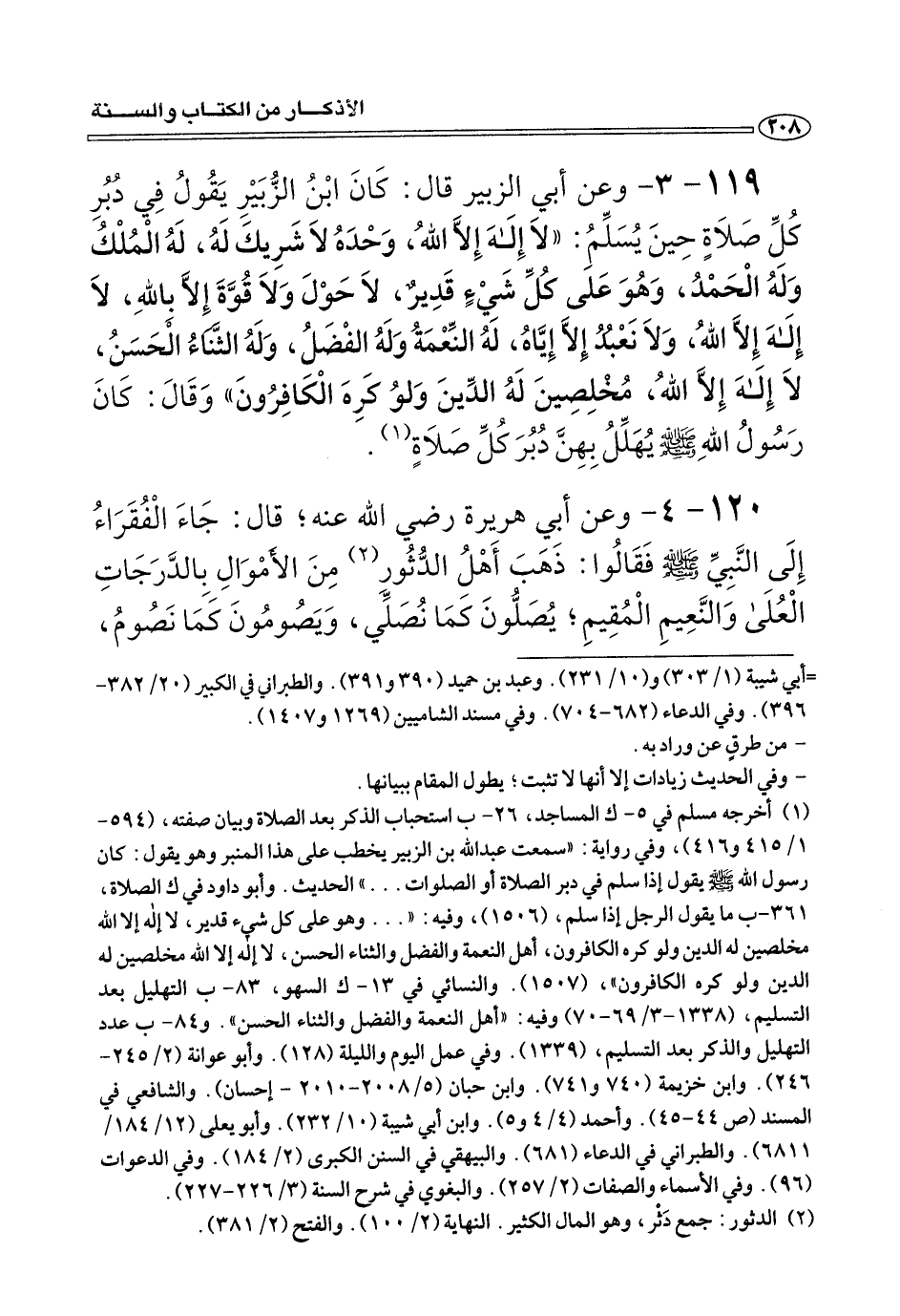 ١١٩ - ٣ - وعن أبي الزبير قَالَ: كَانَ ابْنُ الزُّبَيْرِ يَقُولُ فِي دُبُرِ كُلِّ صَلَاةٍ حِينَ يُسَلِّمُ: «لَا إَلَهَ إِلَاّ اللهُ، وَحْدَهُ لَا شَرِيكَ لَهُ، لَهُ الْمُلْكُ وَلَهُ الْحَمْدُ، وَهُوَ عَلَى كُلِّ شَيْءٍ قَدِيرٌ، لَا حَوْلَ وَلَا قُوَّةَ إِلَاّ بِاللهِ، لَا إِلَهَ إِلَاّ اللهُ، وَلَا نَعْبُدُ إِلَاّ إِيَّاهُ، لَهُ النِّعْمَةُ وَلَهُ الفْضَلُ، وَلَهُ الثَّنَاءُ الْحَسَنُ، لَا إِلَهَ إِلَاّ اللهُ، مُخْلِصِينَ لَهُ الدِّينَ وَلوُ كَرِهَ الْكَافِرُونَ» وَقَالَ: كَانَ رَسُولُ الله صلى الله عليه وسلم يُهَلِّلُ بِهِنَّ دُبُرَ كُلِّ صَلَاةٍ (¬١).