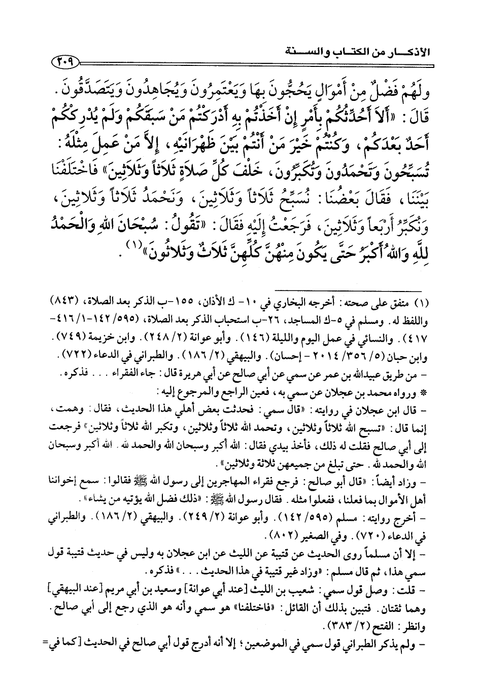 ولَهُمْ فَضْلٌ مِنْ أَمْوَالٍ يَحُجُّونَ بِهَا وَيَعْتَمِرُونَ وَيُجَاهِدُونَ وَيَتَصَدَّقُونَ. قَالَ: «أَلَا أُحُدِّثُكُمْ بِأَمْرٍ إِنْ أَخَذْتُمْ بهِ أَدْرَكْتُم مَنْ سَبَقَكُمْ وَلَمْ يُدْرِكْكُمْ أَحَدٌ بَعْدَكُم، وَكُنْتُمْ خَيْرَ مَنْ أَنْتُمْ بَيْنَ ظَهْرَانَيْهِ، إِلَاّ مَنْ عَمِلَ مِثْلَهُ: تُسَبِّحُونَ وَتَحْمِدُونَ وَتُكَبِّرُونَ، خَلْفَ كُلِّ صَلاةٍ، ثَلَاثًا وَثَلَاثِينَ» فَاخْتَلَفْنَا بَيْنَنَا، فَقَالَ بَعْضُنَا: نُسَبِّحُ ثَلَاثًا وَثَلَاثِينَ، وَنَحْمَدُ ثَلَاثًا وَثَلَاثِينَ، وَنُكَبِّرُ أَرْبَعًا وَثَلَاثِينَ، فَرَجَعْتُ إِلَيْهِ فَقَالَ: «تَقُولُ: سُبْحَانَ اللهِ والْحَمْدُ للهِ واللهُ أَكْبَرُ حَتَّى يَكُونَ مِنْهُنَّ كُلِّهِنَّ ثَلَاثًا وَثَلَاثُونَ» (¬١).