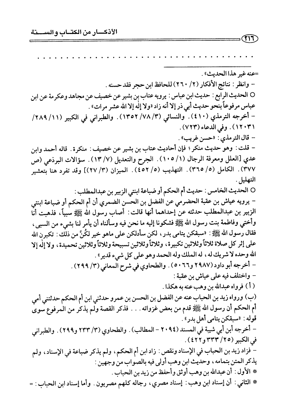 - يرويه عياش بن عقبة الحضرمي عن الفضل بن الحسن الضمري أن أم الحكم أو ضباعة ابنتي الزبير بن عبد المطلب حدثته عن إحداهما أنها قالت: أصاب رسول الله صلى الله عليه وسلم سبيًا، فذهبت أنا وأختي وفاطمة بنت رسول الله صلى الله عليه وسلم فشكونا إليه ما نحن فيه وسألنا أن يأمر لنا بشيء من السبي، فقال رسول الله صلى الله عليه وسلم: «سبقكن يتامى بدر، لكن سأدلكن على ما هو خير لكن من ذلك: تكبرن الله على إثر كل صلاة ثلاثًا وثلاثين تكبيرة، وثلاثًا وثلاثين تسبيحة وثلاثًا وثلاثين تحميدة، ولا إله إلا الله وحده لا شريك له، له الملك وله الحمد وهو على كل شيء قدير».