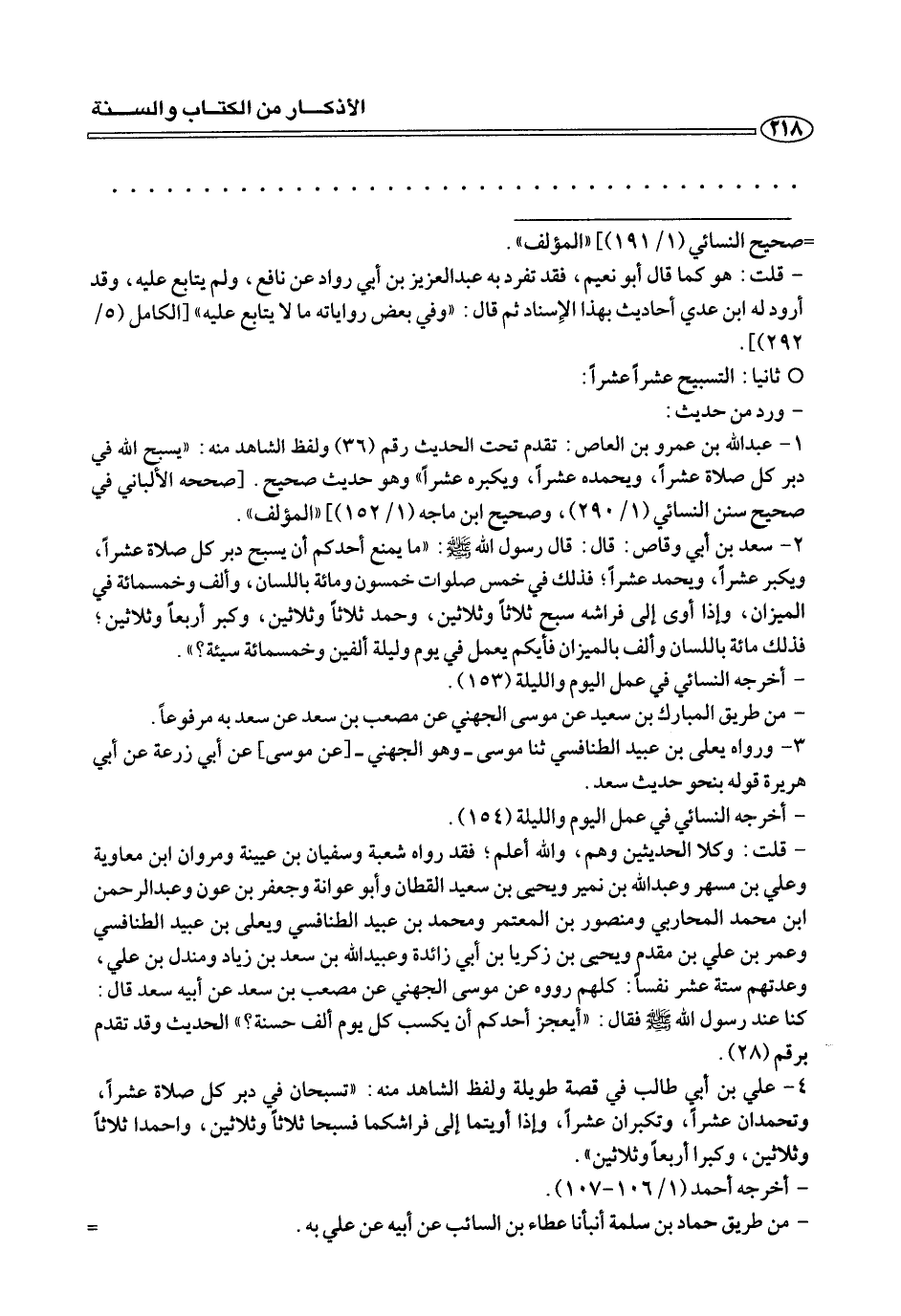 ١ - عبد الله بن عمرو بن العاص: تقدم تحت الحديث رقم (٣٦) ولفظ الشاهد منه: «يسبح الله في دبر كل صلاة عشرًا، ويحمد عشرًا «وهو حديث صحيح. [صححه الألباني في صحيح سنن النسائي (١/ ٢٩٠)، وصحيح ابن ماجه (١/ ١٥٢)] «المؤلف».