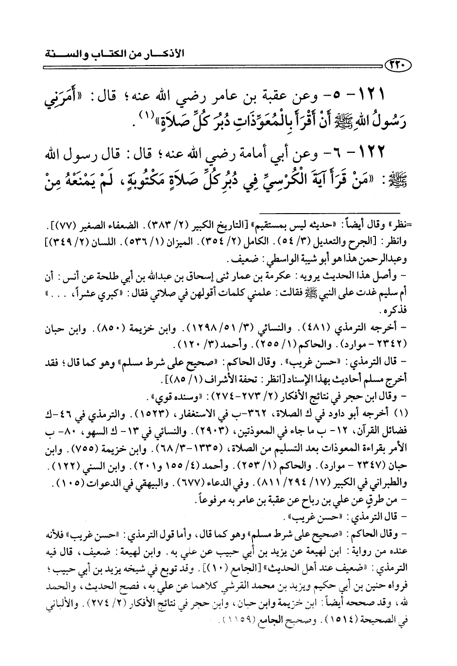١٢٢ - ٦ - وعن أبي أمامة رضي الله عنه؛ قَالَ: قَالَ رسول الله صلى الله عليه وسلم: «مَنْ قَرَأَ آيَةَ الْكُرسِيِّ فِي دُبُرِ كُلِّ صَلَاةٍ مَكْتُوبَةٍ، لَمْ يَمْنَعْهُ مِنْ