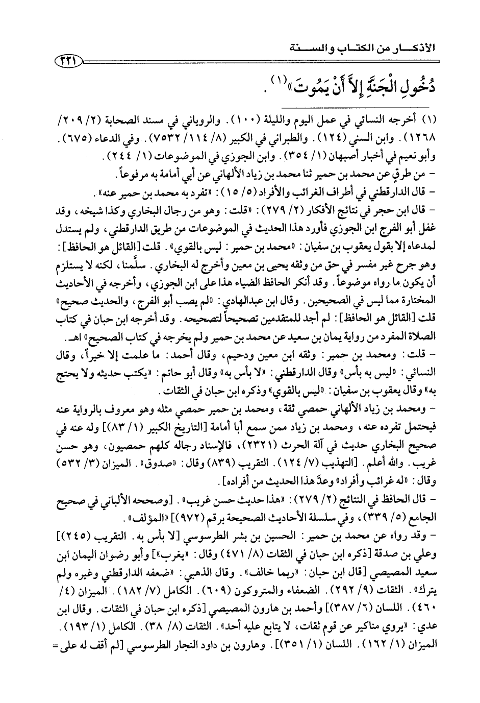 - ومحمد بن زيان الألهاني حمصي ثقة، ومحمد بن حمير حمصي مثله وهو معروف بالرواية عنه فيحتمل تفرده عنه، محمد بن زياد ممن سمع أبا أمامة [تاريخ الكبير (١/ ٨٣)] وله عنه في صحيح البخاري حديث في آلة الحرث (٢٣٢١)، فالإسناد رجاله كلهم حمصيون، وهو حسن غريب. والله أعلم. [التهذيب (٧/ ١٢٤). التقريب (٨٣٩) وقال: «صدوق «. الميزان (٣/ ٥٣٢) وقال: «له غرائب وأفراد «وعد هذا الحديث من أفراده].